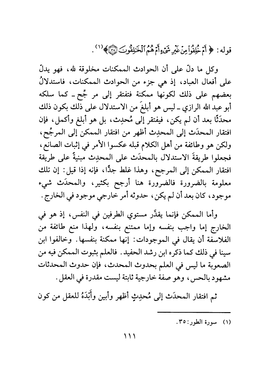 وكل ما دلّ على أن الحوادث الممكنات مخلوقة لله، فهو يدلّ على أفعال العباد، إذ هي جزء من الحوادث الممكنات، فاستدلالُ بعضهم على ذلك لكونها ممكنة فتفتقر إلى مرجِّح- كما سلكه أبو عبد الله الرازي- ليس هو أبلغَ من الاستدلال على ذلك بكون ذلك محدَثًا بعد أن لم يكن، فيفتقر إلى مُحدِث، بل هو أبلغ وأكمل، فإن افتقار المحدَث إلى المحدِث أظهر من افتقار الممكن إلى المرجِّح، ولكن هو وطائفة من أهل الكلام قبله عكسوا الأمر في إثبات الصانع، فجعلوا طريقةَ الاستدلال بالمحدَث على المحدِث مبنيةً على طريقة افتقار الممكن إلى المرجح، وهذا غلط جدًّا، فإنه إذا قيل: إن تلك معلومة بالضرورة فالضرورة هنا أرجح بكثير، والمحدَث شيء موجود، كان بعد أن لم يكن، حدوثه أمر خارجي موجود في الخارج.