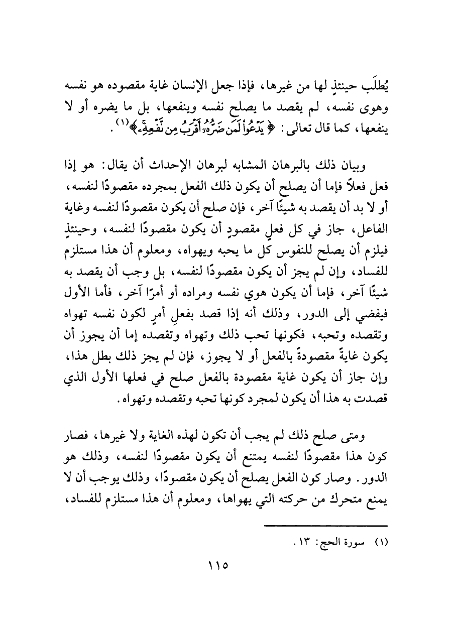 وبيان ذلك بالبرهان المشابه لبرهان الإحداث أن يقال: هو إذا فعل فعلاً فإما أن يصلح أن يكون ذلك الفعل بمجرده مقصودًا لنفسه، أو لا بد أن يقصد به شيئًا آخر، فإن صلح أن يكون مقصودًا لنفسه وغاية الفاعل، جاز في كل فعلٍ مقصود أن يكون مقصودًا لنفسه، وحينئذ فيلزم أن يصلح للنفوس كل ما يحبه ويهواه، ومعلوم أن هذا مستلزم للفساد، وإن لم يجز أن يكون مقصودًا لنفسه، بل وجب أن يقصد به شيئًا آخر، فإما أن يكون هوي نفسه ومراده أو أمرًا آخر، فأما الأول فيفضي إلى الدور، وذلك أنه إذا قصد بفعلِ أمرٍ لكون نفسه تهواه وتقصده وتحبه، فكونها تحب ذلك وتهواه وتقصده إما أن يجوز أن يكون غايةً مقصودةً بالفعل أو لا يجوز، فإن لم يجز ذلك بطل هذا، وإن جاز أن يكون غاية مقصودة بالفعل صلح في فعلها الأول الذي قصدت به هذا أن يكون لمجرد كونها تحبه وتقصده وتهواه.