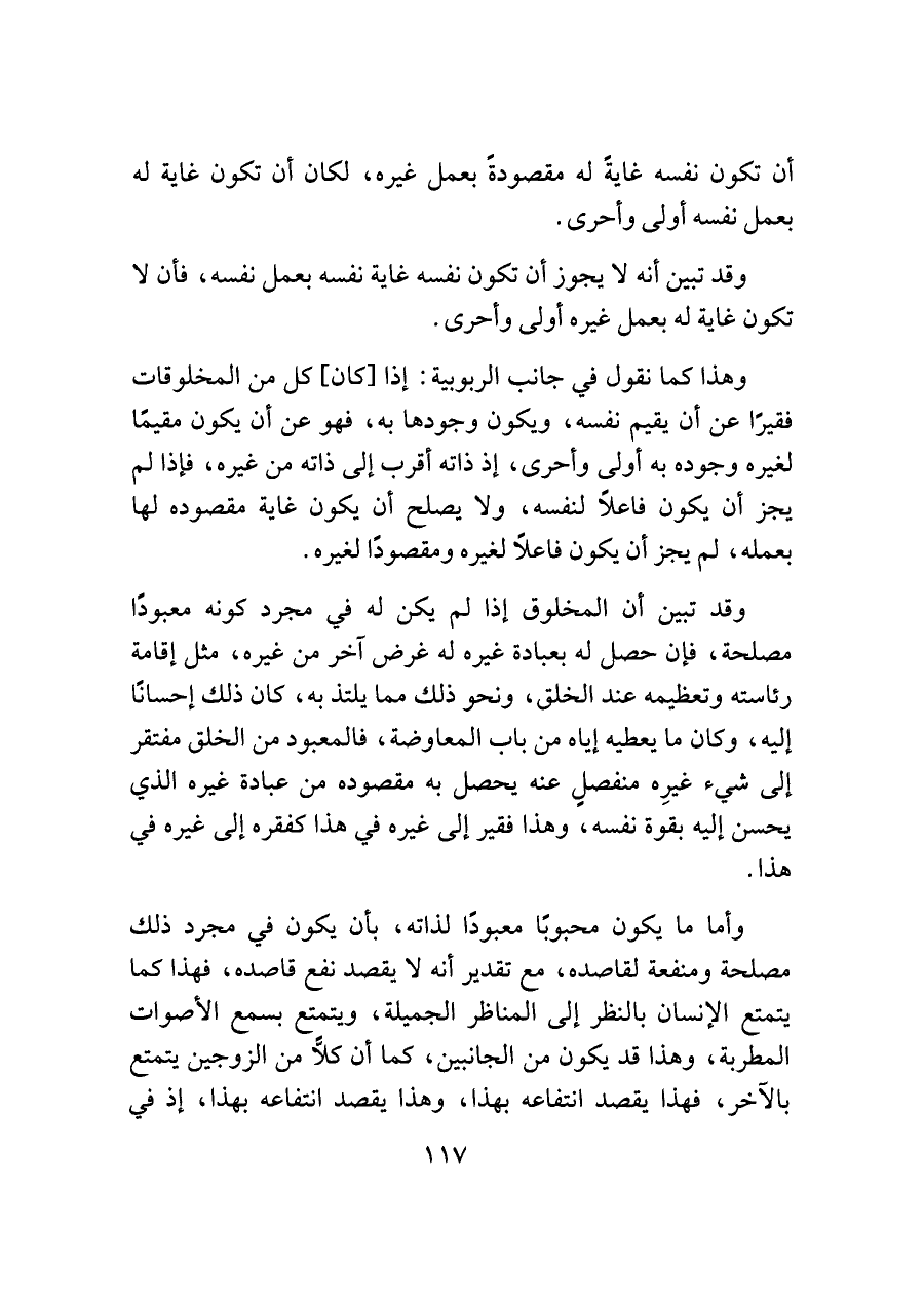 وقد تبين أنه لا يجوز أن تكون نفسه غاية نفسه بعمل نفسه، فأن لا تكون غاية له بعمل غيره أولى وأحرى.
