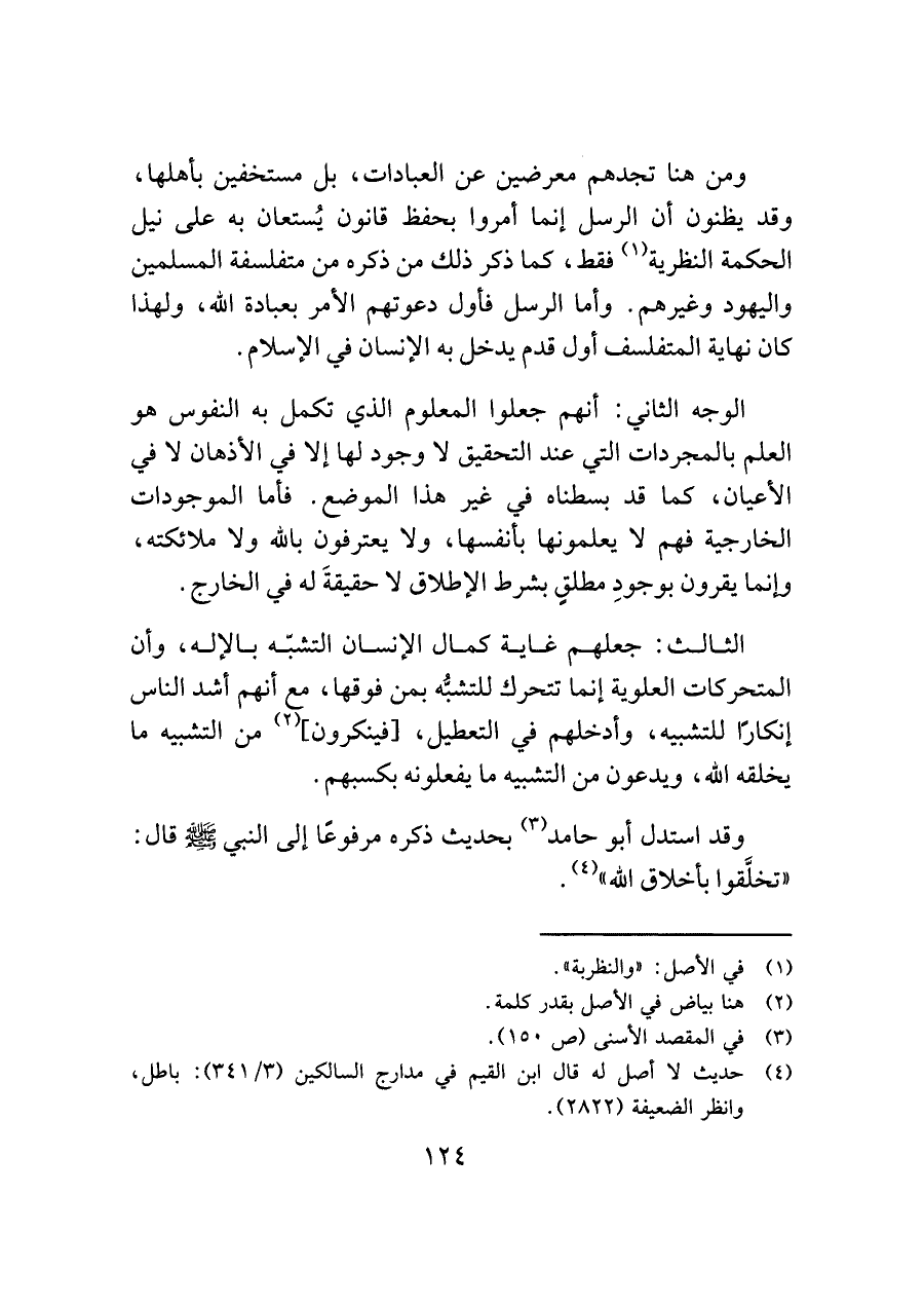 ومن هنا تجدهم معرضين عن العبادات، بل مستخفين بأهلها، وقد يظنون أن الرسل إنما أمروا بحفظ قانون يُستعان به على نيل الحكمة النظرية (¬١) فقط، كما ذكر ذلك من ذكره من متفلسفة المسلمين واليهود وغيرهم. وأما الرسل فأول دعوتهم الأمر بعبادة الله، ولهذا كان نهاية المتفلسف أول قدم يدخل به الإنسان في الإسلام.