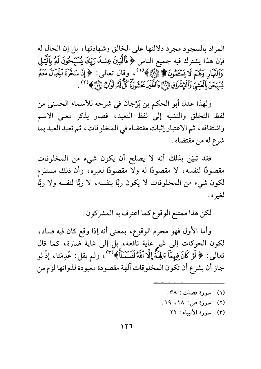 وأما الأول فهو محرم الوقوع، بمعنى أنه إذا وقع كان فيه فساد، لكون الحركات إلى غير غاية نافعة، بل إلى غاية ضارة، كما قال تعالى: (لَوْ كَانَ فِيهِمَا آَلِهَةٌ إِلَّا اللَّهُ لَفَسَدَتَا) (¬٣)، ولم يقل: عُدِمَتا، إذْ لو جاز أن يشرع أن تكون المخلوقات آلهة مقصودة معبودة لذواتها لزم من