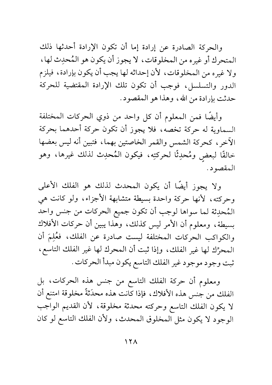 والحركة الصادرة عن إرادة إما أن تكون الإرادة أحدثها ذلك المتحرك أو غيره من المخلوقات، لا يجوز أن يكون هو المُحدِث لها، ولا غيره من المخلوقات، لأن إحداثه لها يجب أن يكون بإرادة، فيلزم الدور والتسلسل، فوجب أن تكون تلك الإرادة المقتضية للحركة حدثت بإرادة من الله، وهذا هو المقصود.