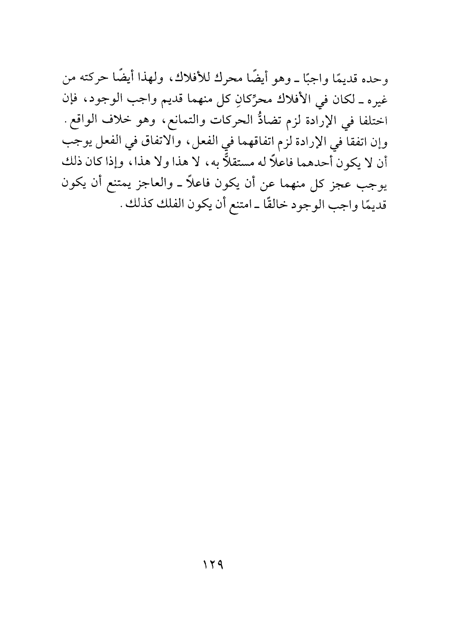 وحده قديمًا واجبًا- وهو أيضا محرك للأفلاك، ولهذا أيضًا حركته من غيره- لكان في الأفلاك محرِّكانِ كل منهما قديم واجب الوجود، فإن اختلفا في الإرادة لزم تضادُّ الحركات والتمانع، وهو خلاف الواقع. وإن اتفقا في الإرادة لزم اتفاقهما في الفعل، والاتفاق في الفعل يوجب أن لا يكون أحدهما فاعلاً له مستقلاًّ به، لا هذا ولا هذا، وإذا كان ذلك يوجب عجز كل منهما عن أن يكون فاعلاً- والعاجز يمتنع أن يكون قديمًا واجب الوجود خالقًا- امتنع أن يكون الفلك كذلك.