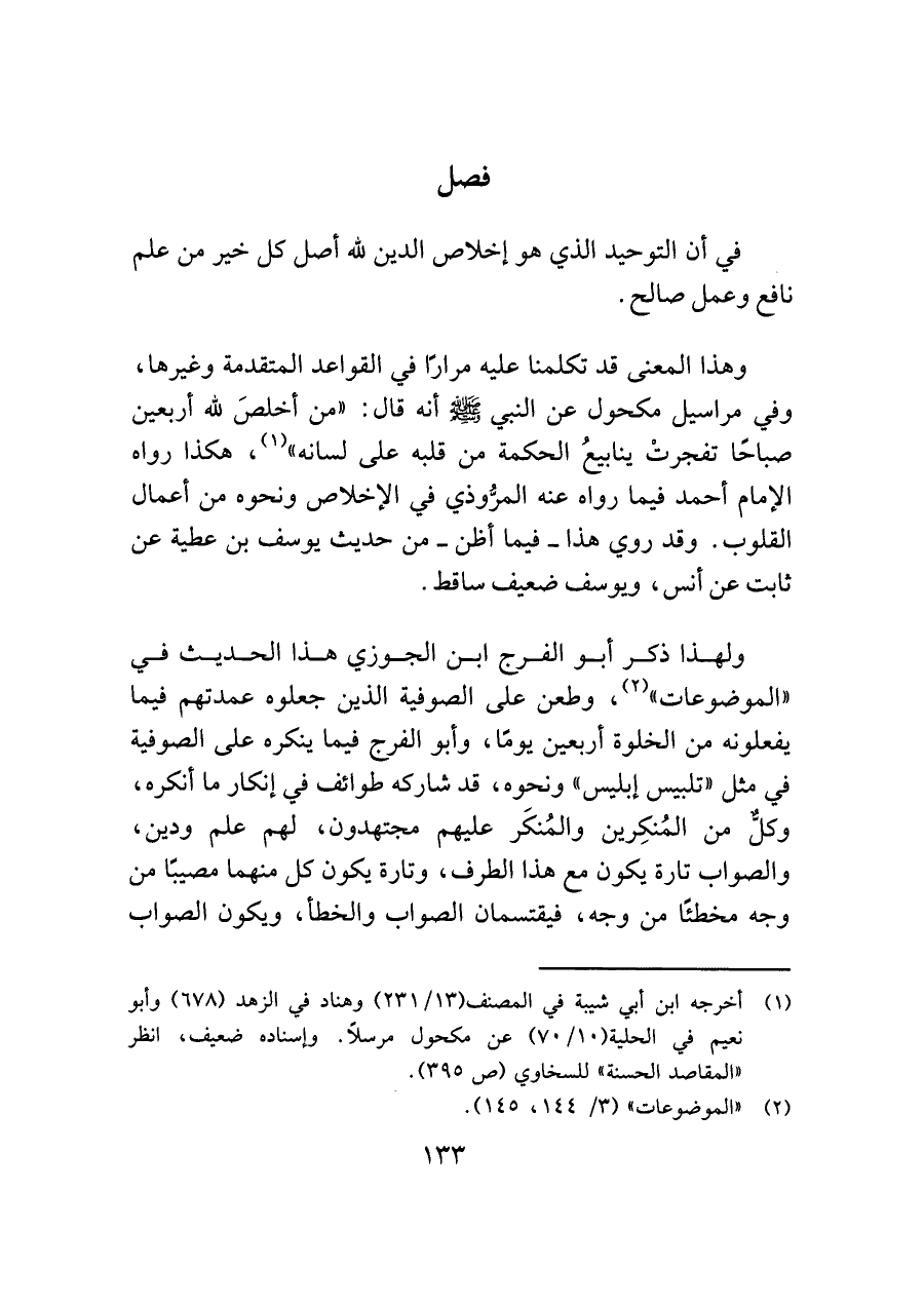 وهذا المعنى قد تكلمنا عليه مرارًا في القواعد المتقدمة وغيرها، وفي مراسيل مكحول عن النبي - صَلَّى اللَّهُ عَلَيْهِ وَسَلَّمَ - أنه قال: "من أخلصَ لله أربعين صباحًا تفجرتْ ينابيعُ الحكمة من قلبه على لسانه " (¬١)، هكذا رواه الإمام أحمد فيما رواه عنه المروذي في الإخلاص ونحوه من أعمال القلوب. وقد روي هذا- فيما أظن- من حديث يوسف بن عطية عن ثابت عن أنس، ويوسف ضعيف ساقط.