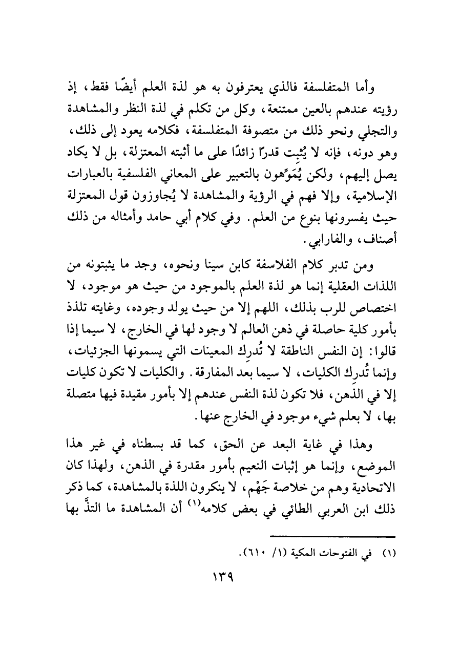وأما المتفلسفة فالذي يعترفون به هو لذة العلم أيضًا فقط، إذ رؤيته عندهم بالعين ممتنعة، وكل من تكلم في لذة النظر والمشاهدة والتجلي ونحو ذلك من متصوفة المتفلسفة، فكلامه يعود إلى ذلك، وهو دونه، فإنه لا يثبت قدرًا زائدًا على ما أثبته المعتزلة، بل لا يكاد يصل إليهم، ولكن يُمَوِّهون بالتعبير على المعاني الفلسفية بالعبارات الإسلامية، وإلا فهم في الرؤية والمشاهدة لا يُجاوزون قول المعتزلة حيث يفسرونها بنوع من العلم. وفي كلام أبي حامد وأمثاله من ذلك أصناف، والفارابي.