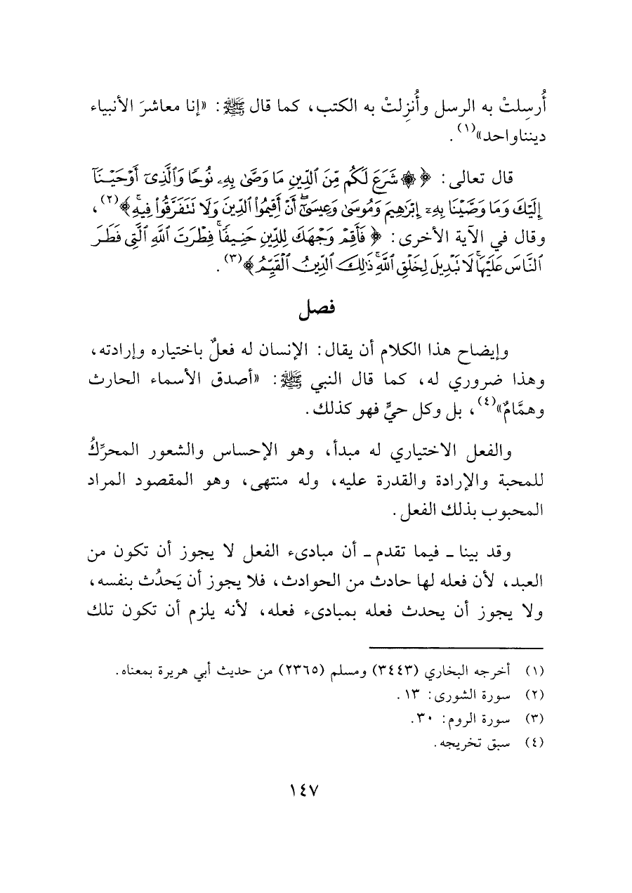 وإيضاح هذا الكلام أن يقال: الإنسان له فعلٌ باختياره وإرادته، وهذا ضروري له، كما قال النبي - صَلَّى اللَّهُ عَلَيْهِ وَسَلَّمَ -:" أصدق الأسماء الحارث وهمَّامٌ " (¬٤)، بل وكل حيٍّ فهو كذلك.