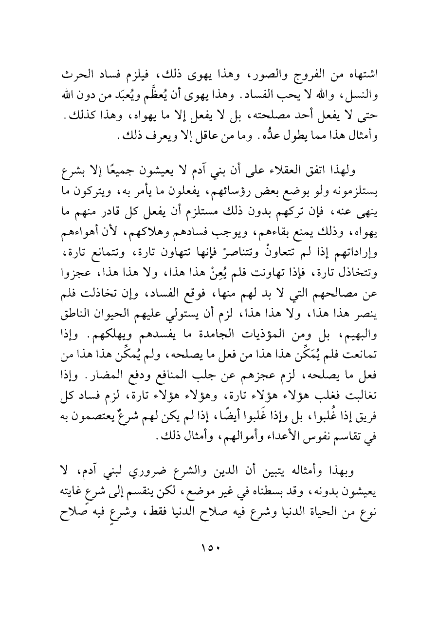 ولهذا اتفق العقلاء على أن بني آدم لا يعيشون جميعًا إلا بشرع يستلزمونه ولو بوضع بعض رؤسائهم، يفعلون ما يأمر به، ويتركون ما ينهى عنه، فإن تركهم بدون " ذلك مستلزم أن يفعل كل قادر منهم ما يهواه، وذلك يمنع بقاءهم، ويوجب فسادهم وهلاكهم، لأن أهواءهم وإراداتهم إذا لم تتعاونْ وتتناصرْ فإنها تتهاون تارة، وتتمانع تارة، وتتخاذل تارة، فإذا تهاونت فلم يُعِنْ هذا هذا، ولا هذا هذا، عجزوا عن مصالحهم التي لا بد لهم منها، فوقع الفساد، وإن تخاذلت فلم ينصر هذا هذا، ولا هذا هذا، لزم أن يستولي عليهم الحيوان الناطق والبهيم، بل ومن المؤذيات الجامدة ما يفسدهم ويهلكهم. وإذا تمانعت فلم يُمَكِّن هذا هذا من فعل ما يصلحه، ولم يُمكِّن هذا هذا من فعل ما يصلحه، لزم عجزهم عن جلب المنافع ودفع المضار. وإذا تغالبت فغلب هؤلاء هؤلاء تارة، وهؤلاء هؤلاء تارة، لزم فساد كل فريق إذا غُلبوا، بل وإذا غَلبوا أيضًا، إذا لم يكن لهم شرع يعتصمون به في تقاسم نفوس الأعداء وأموالهم، وأمثال ذلك.