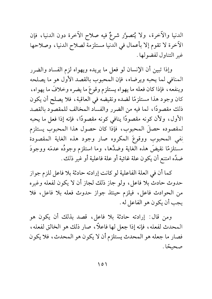 وإذا تبين أن الإنسان لو فعل ما يريده ويهواه لزم الفساد والضرر المنافي لما يحبه ويرضاه، فإن المحبوب بالقصد الأول هو ما يصلحه وينفعه، فإذا كان فعله ما يهواه يستلزم وقوعَ ما يضره وخلافَ ما يهواه، كان وجود هذا مستلزمًا لضده ونقيضه في العاقبة، فلا يصلح أن يكون ذلك مقصودًا، لما فيه من الضرر والفساد المخالف للمقصود بالقصد الأول، ولأن كونه مقصودًا ينافي كونه مقصودًا، فإنه إذا فعل ما يحبه لمقصوده حصلَ المحبوب، فإذا كان حصول هذا المحبوب يستلزم نفي المحبوب ووقوعَ المكروه صار وجود هذه الغاية المقصودة مستلزمًا نقيضَ هذه الغاية وضدَّها، وما استلزم وجودُه عدمَه ووجودَ ضدِّه امتنع أن يكون علة غائية أو علة فاعلية أو غير ذلك.