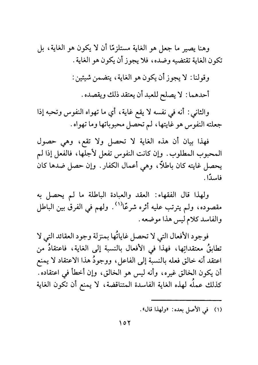 فوجود الأفعال التي لا تحصل غاياتُها بمنزلة وجود العقائد التي لا تطابقُ معتقداتِها، فهذا في الأفعال بالنسبة إلى الغاية، فاعتقادُ من اعتقد أنه خالق فعله بالنسبة إلى الفاعل، ووجودُ هذا الاعتقاد لا يمنع أن يكون الخالق غيره، وأنه ليس هو الخالق، وإن أخطأ في اعتقاده. كذلك عملُه لهذه الغاية الفاسدة المتناقضة، لا يمنع أن تكون الغاية