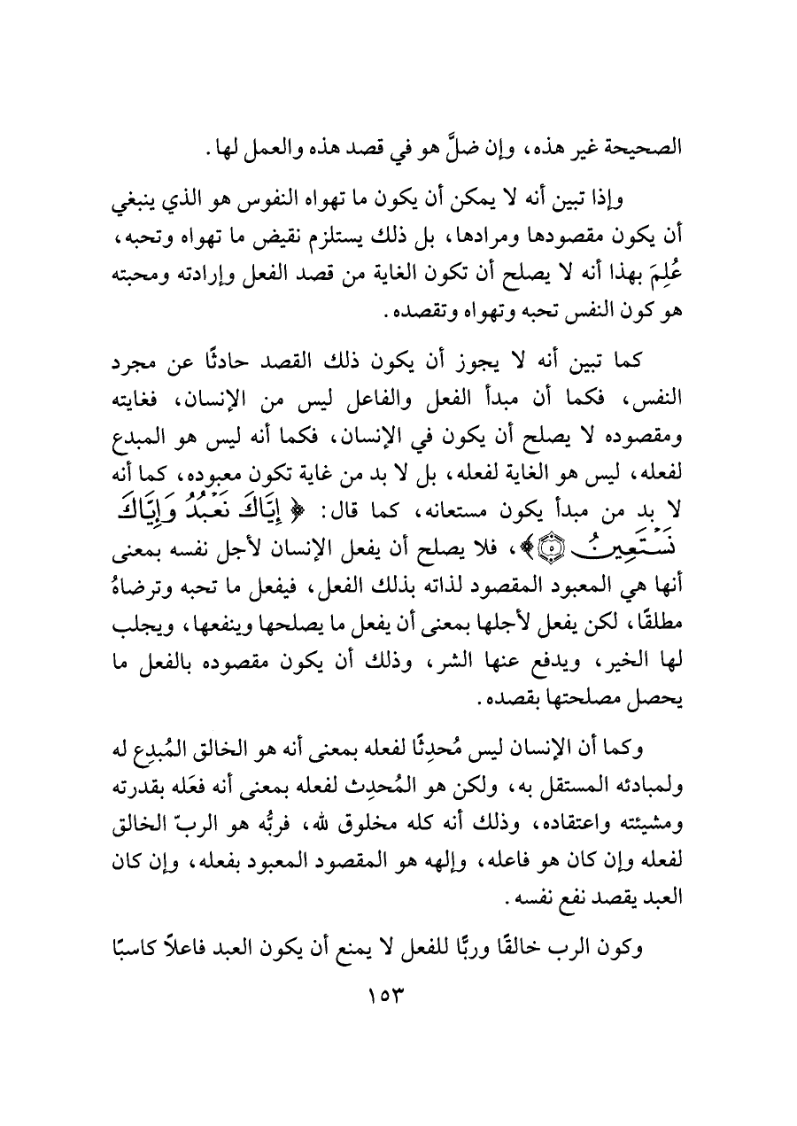 كما تبين أنه لا يجوز أن يكون ذلك القصد حادثًا عن مجرد النفس، فكما أن مبدأ الفعل والفاعل ليس من الإنسان، فغايته ومقصوده لا يصلح أن يكون في الإنسان، فكما أنه ليس هو المباع لفعله، ليس هو الغاية لفعله، بل لا بد من غاية تكون معِبوده، كما أنه لاِ بد من مبدأ يكون مستعانه، كما قال: (إِيَّاكَ نَعْبُدُ وَإِيَّاكَ نَسْتَعِينُ (٥)) فلا يصلح أن يفعل الإنسان لأجل نفسه بمعنى أنها هي المعبود المقصود لذاته بذلك الفعل، فيفعل ما تحبه وترضاهُ مطلقًا، لكن يفعل لأجلها بمعنى أن يفعل ما يصلحها وينفعها، ويجلب لها الخير، ويدفع عنها الشر، وذلك أن يكون مقصوده بالفعل ما يحصل مصلحتها بقصده.