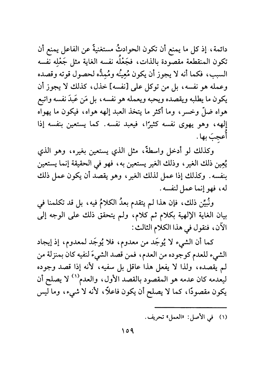 دائمة، إذ كل ما يمنع أن تكون الحوادثُ مستغنيةً عن الفاعل يمنع أن تكون المنقطعة مقصودة بالذات، فجَعْلُه نفسه الغاية مثل جَعْلِه نفسه السبب، فكما أنه لا يجوز أن يكون مُعِينُه ومُمِدُّه لحصول قوته وقصده وعمله هو نفسه، بل من توكل على [نفسه] خذل، كذلك لا يجوز أن يكون ما يطلبه ويقصده ويحبه ويعمله هو نفسه، بل مَن عَبدَ نفسه واتبع هواه ضلّ وخسر، وما أكثر ما يتخذ العبد إلهه هواه، فيكون ما يهواه إلهه، وهو يهوى نفسه كثيرًا، فيعبد نفسه. كما يستعين بنفسه إذا أُعجِبَ بها.