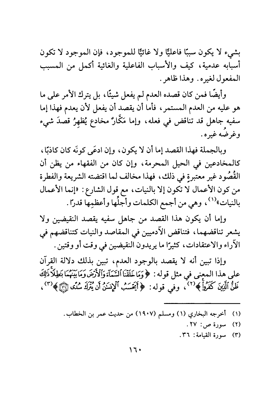 وأيضًا فمن كان قصده العدم لم يفعل شيئًا، بل يترك الأمر على ما هو عليه من العدم المستمر، فاما أن يقصد أن يفعل لأن يعدم فهذا إما سفيه جاهل قد تناقض في فعله، وإما مَكَّارٌ مخادع يُظهِرُ قصدَ شيء وغرضُه غيره.