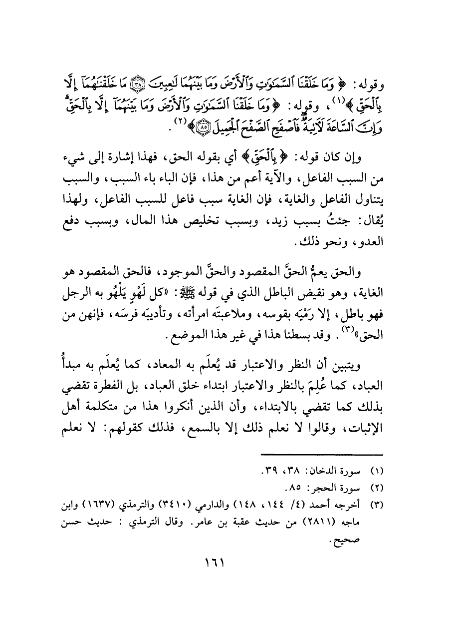 وقوله: (وَمَا خَلَقْنَا السَّمَاوَاتِ وَالْأَرْضَ وَمَا بَيْنَهُمَا لَاعِبِينَ (٣٨) مَا خَلَقْنَاهُمَا إِلَّا بِالْحَقِّ) (¬١)، وقوله: (وَمَا خَلَقْنَا السَّمَاوَاتِ وَالْأَرْضَ وَمَا بَيْنَهُمَا إِلَّا بِالْحَقِّ وَإِنَّ السَّاعَةَ لَآَتِيَةٌ فَاصْفَحِ الصَّفْحَ الْجَمِيلَ (٨٥)) (¬٢).