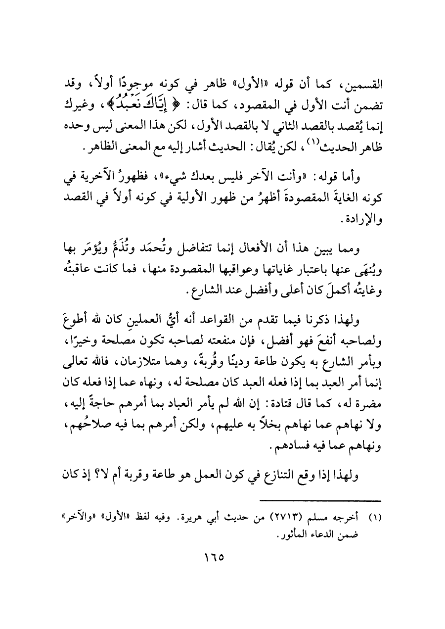 القسمين، كما أن قوله "الأول" ظاهر في كونه موجودًا أولاً، وقد تضمن أنت الأول في المقصود، كما قال: (إِيَّاكَ نَعْبُدُ) وغيرك إنما يُقصد بالقصد الثاني لا بالقصد الأول، لكن هذا المعنى ليس وحده ظاهر الحديث (¬١)، لكن يُقال: الحديث أشار إليه مع المعنى الظاهر.