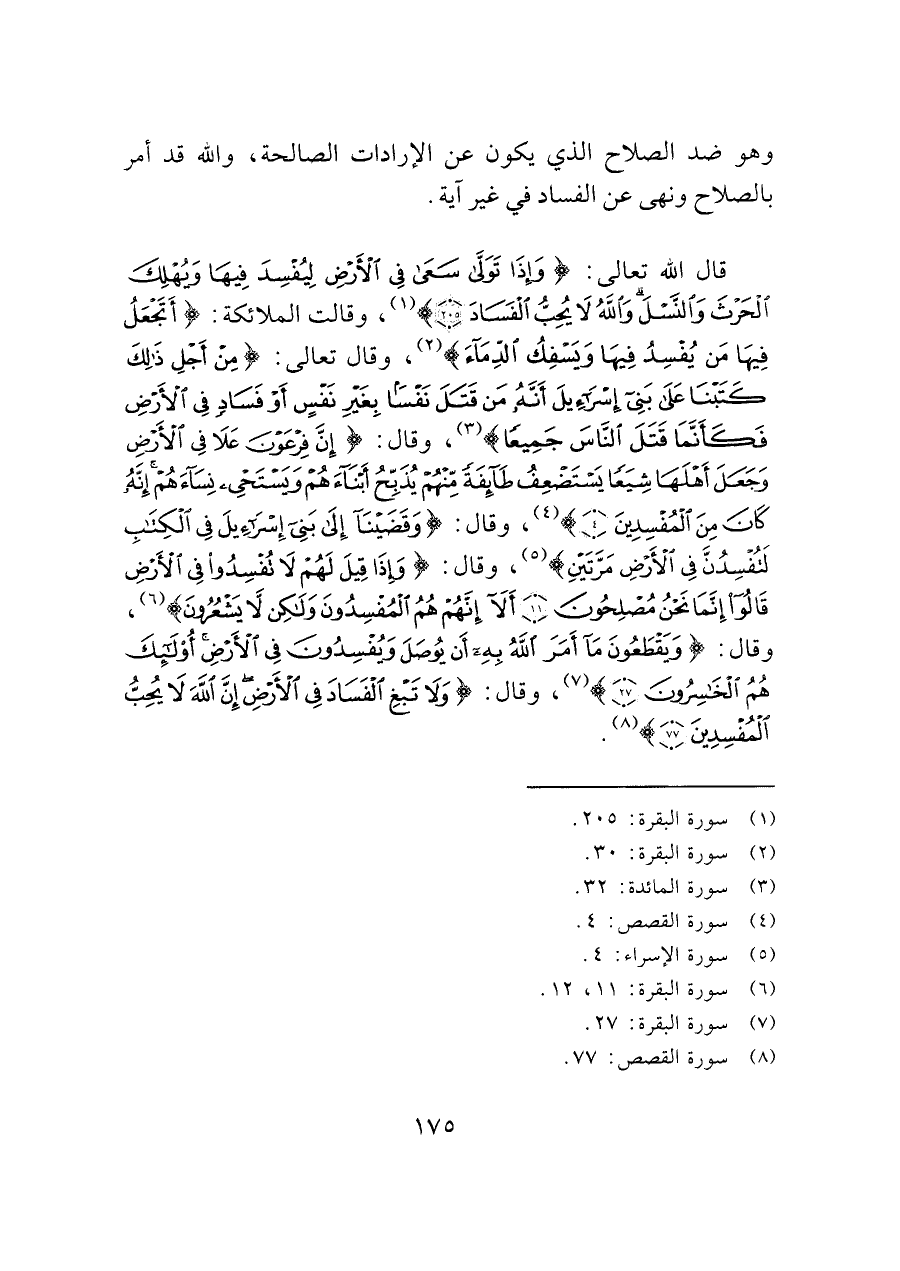قال الله تعالى: (وَإِذَا تَوَلَّى سَعَى فِي الْأَرْضِ لِيُفْسِدَ فِيهَا وَيُهْلِكَ الْحَرْثَ وَالنَّسْلَ وَاللَّهُ لَا يُحِبُّ الْفَسَادَ (٢٠٥)) (¬١)، وقالت الملائكة: (أَتَجْعَلُ فِيهَا مَنْ يُفْسِدُ فِيهَا وَيَسْفِكُ الدِّمَاءَ) (¬٢)، وقال تعالى: (مِنْ أَجْلِ ذَلِكَ كَتَبْنَا عَلَى بَنِي إِسْرَائِيلَ أَنَّهُ مَنْ قَتَلَ نَفْسًا بِغَيْرِ نَفْسٍ أَوْ فَسَادٍ فِي الْأَرْضِ فَكَأَنَّمَا قَتَلَ النَّاسَ جَمِيعًا) (¬٣)، وقال: (إِنَّ فِرْعَوْنَ عَلَا فِي الْأَرْضِ وَجَعَلَ أَهْلَهَا شِيَعًا يَسْتَضْعِفُ طَائِفَةً مِنْهُمْ يُذَبِّحُ أَبْنَاءَهُمْ وَيَسْتَحْيِي نِسَاءَهُمْ إِنَّهُ كَانَ مِنَ الْمُفْسِدِينَ (٤)) (¬٤)، وقال: (وَقَضَيْنَا إِلَى بَنِي إِسْرَائِيلَ فِي الْكِتَابِ لَتُفْسِدُنَّ فِي الْأَرْضِ مَرَّتَيْنِ) (¬٥)،وقال: (وَإِذَا قِيلَ لَهُمْ لَا تُفْسِدُوا فِي الْأَرْضِ قَالُوا إِنَّمَا نَحْنُ مُصْلِحُونَ (١١) أَلَا إِنَّهُمْ هُمُ الْمُفْسِدُونَ وَلَكِنْ لَا يَشْعُرُونَ) (¬٦)، وقال (وَيَقْطَعُونَ مَا أَمَرَ اللَّهُ بِهِ أَنْ يُوصَلَ وَيُفْسِدُونَ فِي الْأَرْضِ أُولَئِكَ هُمُ الْخَاسِرُونَ (٢٧)) (¬٧)، وقال: (وَلَا تَبْغِ الْفَسَادَ فِي الْأَرْضِ إِنَّ اللَّهَ لَا يُحِبُّ الْمُفْسِدِينَ (٧٧)) (¬٨).