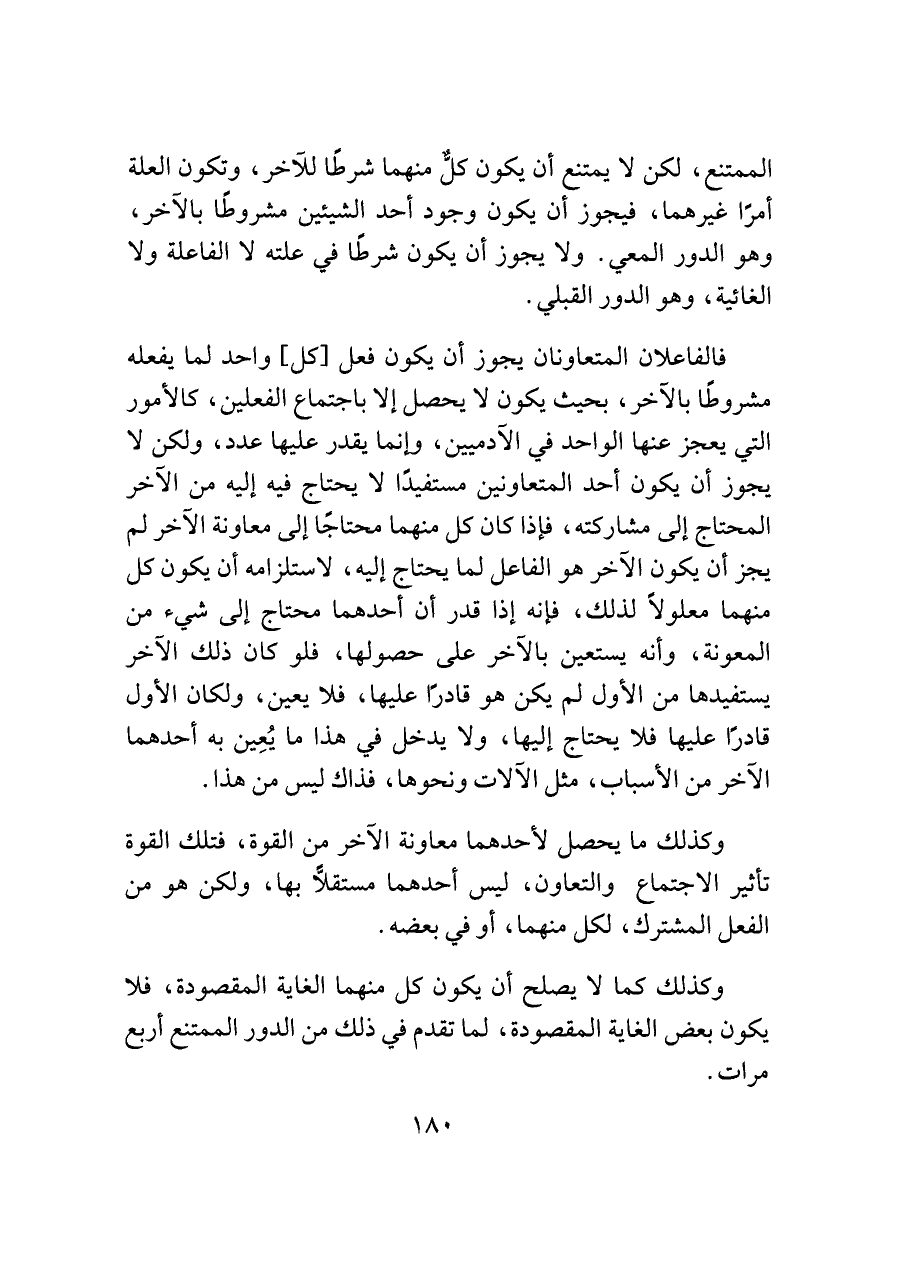 الممتنع، لكن لا يمتنع أن يكون كلّ منهما شرطًا للآخر، وتكون العلة أمرًا غيرهما، فيجوز أن يكون وجود أحد الشيئين مشروطًا بالآخر، وهو الدور المعي. ولا يجوز أن يكون شرطًا في علته لا الفاعلة ولا الغائية، وهو الدور القبلي.