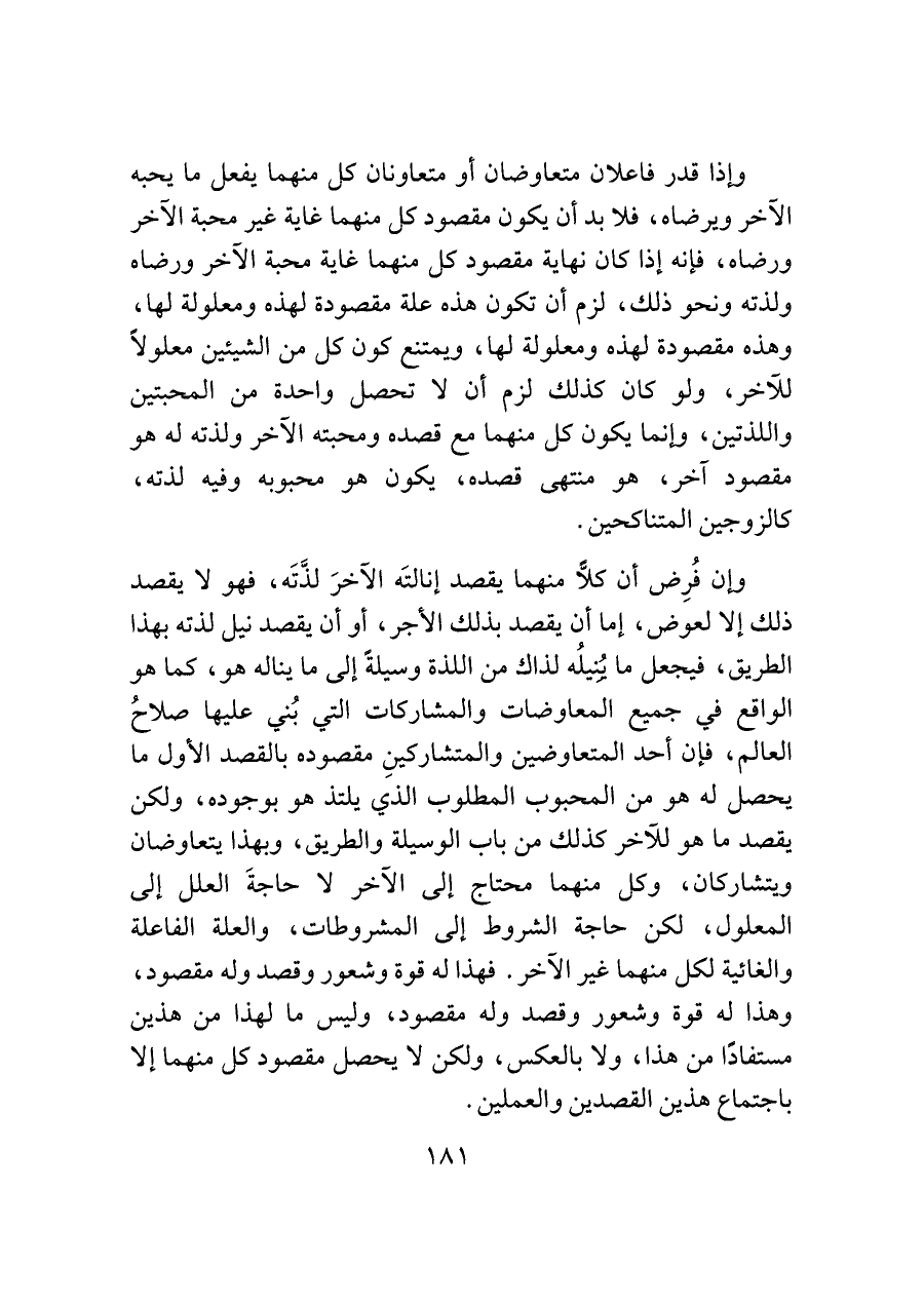 وإن فُرِض أن كلاًّ منهما يقصد إنالتَه الآخر لذَّتَه، فهو لا يقصد ذلك إلا لعوض، إما أن يقصد بذلك الأجر، أو أن يقصد نيل لذته بهذا الطريق، فيجعل ما ينيلُه لذاك من اللذة وسيلةً إلى ما يناله هو، كما هو الواقع في جميع المعاوضات والمشاركات التي بُني عليها صلاحُ العالم، فإن أحد المتعاوضين والمتشاركينِ مقصوده بالقصد الأول ما يحصل له هو من المحبوب المطلوب الذي يلتذ هو بوجوده، ولكن يقصد ما هو للآخر كذلك من باب الوسيلة والطريق، وبهذا يتعاوضان ويتشاركان، وكل منهما محتاج إلى الآخر لا حاجةَ العلل إلى المعلول، لكن حاجة الشروط إلى المشروطات، والعلة الفاعلة والغائية لكل منهما غير الآخر. فهذا له قوة وشعور وقصد وله مقصود، وهذا له قوة وشعور وقصد وله مقصود، وليس ما لهذا من هذين مستفادًا من هذا، ولا بالعكس، ولكن لا يحصل مقصود كل منهما إلا باجتماع هذين القصدين والعملين.