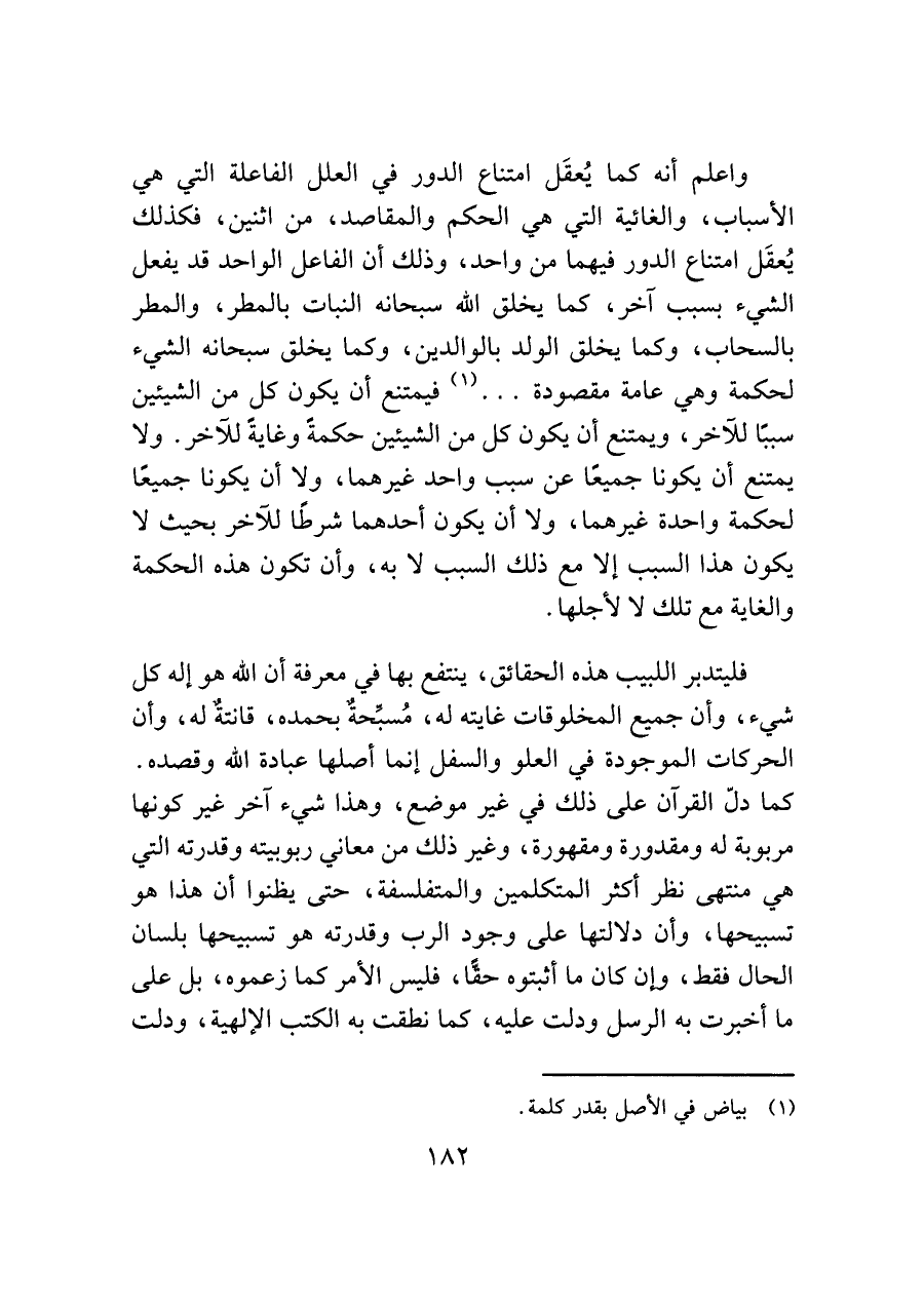واعلم أنه كما يُعقَل امتناع الدور في العلل الفاعلة التي هي الأسباب، والغائية التي هي الحكم والمقاصد، من اثنين، فكذلك يُعقَل امتناع الدور فيهما من واحد، وذلك أن الفاعل الواحد قد يفعل. الشيء بسبب آخر، كما يخلق الله سبحانه النبات بالمطر، والمطر بالسحاب، وكما يخلق الولد بالوالدين، وكما يخلق سبحانه الشيء لحكمة وهي عامة مقصودة ... (¬١) فيمتنع أن يكون كل من الشيئين سببًا للآخر، ويمتنع أن يكون كل من الشيئين حكمةً وغايةً للآخر. ولا يمتنع أن يكونا جميعًا عن سبب واحد غيرهما، ولا أن يكونا جميعًا لحكمة واحدة غيرهما، ولا أن يكون أحدهما شرطًا للآخر بحيث لا يكون هذا السبب إلا مع ذلك السبب لا به، وأن تكون هذه الحكمة والغاية مع تلك لا لأجلها.