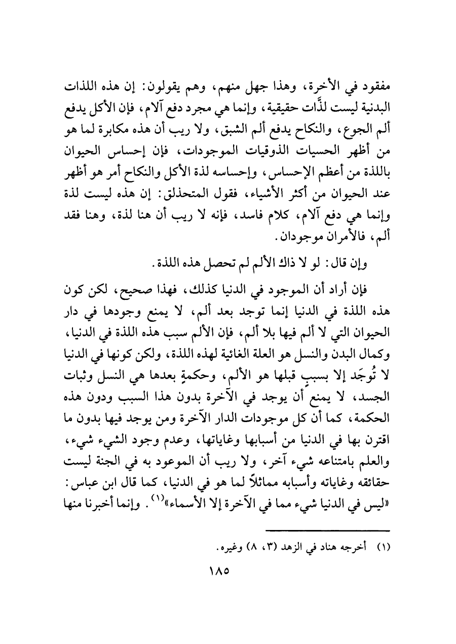 مفقود في الأخرة، وهذا جهل منهم، وهم يقولون: إن هذه اللذات البدنية ليست لذَّات حقيقية، وإنما هي مجرد دفع آلام، فإن الاكل يدفع ألم الجوع، والنكاح يدفع ألم الشبق، ولا ريب أن هذه مكابرة لما هو من أظهر الحسيات الذوقيات الموجودات، فإن إحساس الحيوان باللذة من أعظم الإحساس، وإحساسه لذة الأكل والنكاح أمر هو أظهر عند الحيوان من أكثر الأشياء، فقول المتحذلق: إن هذه ليست لذة وإنما هي دفع اَلام، كلام فاسد، فإنه لا ريب أن هنا لذة، وهنا فقد ألم، فالأمران موجودان.