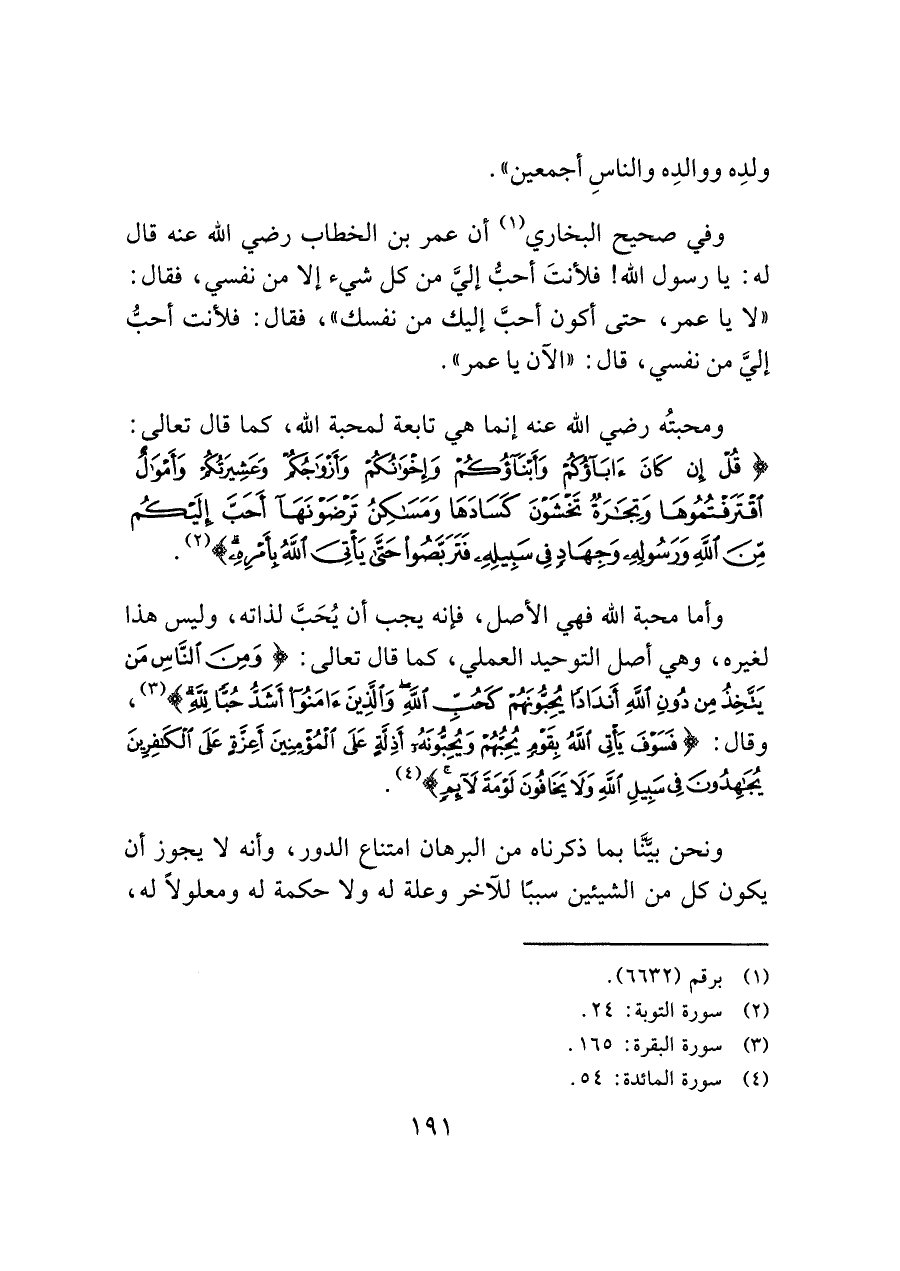 ومحبتُه رضي الله عنه إنما هي تابعة لمحبة الله، كما قال تعالى: (قُلْ إِنْ كَانَ آَبَاؤُكُمْ وَأَبْنَاؤُكُمْ وَإِخْوَانُكُمْ وَأَزْوَاجُكُمْ وَعَشِيرَتُكُمْ وَأَمْوَالٌ اقْتَرَفْتُمُوهَا وَتِجَارَةٌ تَخْشَوْنَ كَسَادَهَا وَمَسَاكِنُ تَرْضَوْنَهَا أَحَبَّ إِلَيْكُمْ مِنَ اللَّهِ وَرَسُولِهِ وَجِهَادٍ فِي سَبِيلِهِ فَتَرَبَّصُوا حَتَّى يَأْتِيَ اللَّهُ بِأَمْرِهِ) (¬٢).