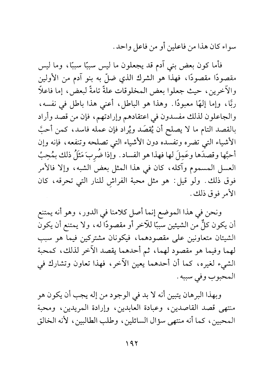فأما كون بعض بني آدم قد يجعلون ما ليس سببًا سببًا، وما ليس مقصودًا مقصودًا، فهذا هو الشرك الذي ضلّ به بنو آدم من الأولين والَاخرين، حيث جعلوا بعض المخلوقات علةً تامةً لبعض، إما فاعلاً ربًّا، وإما إلهًا معبودًا. وهذا هو الباطل، أعني هذا باطل في نفسه، والجاعلون لذلك مفسدون في اعتقادهم وإرادتهم، فإن من قصد وأراد بالقصد التام ما لا يصلح أن يُقصَد ويُراد فإن عمله فاسد، كمن أحبَّ الأشياء التي تضره وتفسده دون الأشياء التي تصلحه وتنفعه، فإنه وإن أحبَّها وقصدَها وعَمِلَ لها فهذا هو الفساد. وإذا ضُرِبَ مَثَلُ ذلك بمُحِبِّ العسل المسموم وآكله، كان في هذا المثل بعض الشبه، وإلا فالأمر فوق ذلك. ولو قيل: هو مثل محبة الفراشِ للنار التي تحرقه، كان الأمر فوق ذلك.
