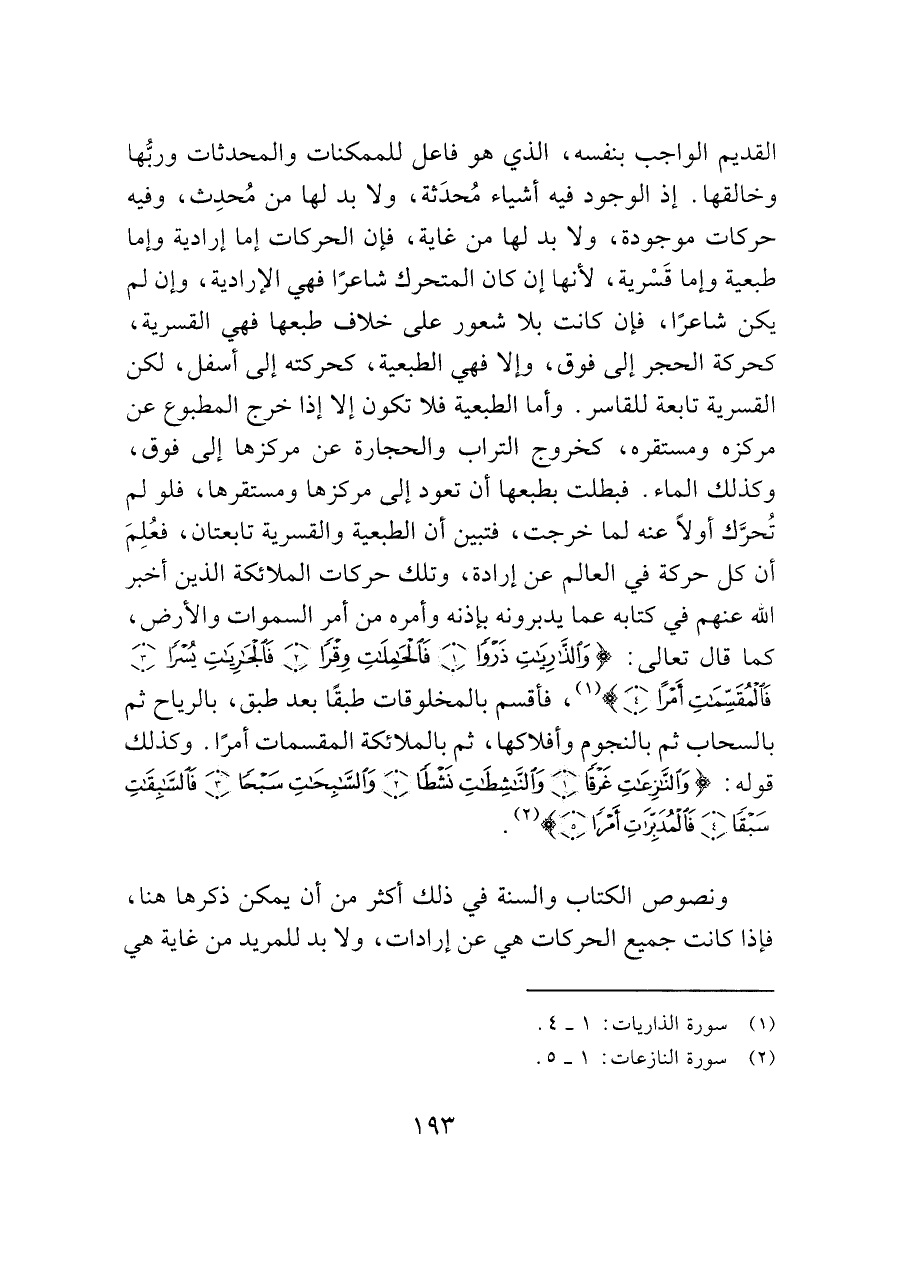 القديم الواجب بنفسه، الذي هو فاعل للممكنات والمحدثات وربُّها وخالقها. إذ الوجود فيه أشياء مُحدَثة، ولا بد لها من مُحدِث، وفيه حركات موجودة، ولا بد لها من غاية، فإن الحركات إما إرادية وإما طبعية وإما قَسْرية، لأنها إن كان المتحرك شاعرًا فهي الإرادية، وإن لم يكن شاعرًا، فإن كانت بلا شعور على خلاف طبعها فهي القسرية، كحركة الحجر إلى فوق، وإلا فهي الطبعية، كحركته إلى أسفل، لكن القسرية تابعة للقاسر. وأما الطبعية فلا تكون إلا إذا خرج المطبوع عن مركزه ومستقره، كخروج التراب والحجارة عن مركزها إلى فوق، وكذلك الماء. فبطلت بطبعها أن تعود إلى مركزها ومستقرها، فلو لم تُحرَّك أولاً عنه لما خرجت، فتبين أن الطبعية والقسرية تابعتان، فعُلِمَ أن كل حركة في العالم عن إرادة، وتلك حركات الملائكة الذين أخبر الله عنهم في كتابه عما يدبرونه بإذنه وأمره من أمر السموات والأرض، كما قال تعالى: (وَالذَّارِيَاتِ ذَرْوًا (١) فَالْحَامِلَاتِ وِقْرًا (٢) فَالْجَارِيَاتِ يُسْرًا (٣) فَالْمُقَسِّمَاتِ أَمْرًا (٤)) (¬١)، فأقسم بالمخلوقات طبقًا بعد طبق، بالرياح ثم بالسحاب ثم بالنجوم وأفلاكها، ثم بالملائكة المقسمات أمرًا. وكذلك قوله: (وَالنَّازِعَاتِ غَرْقًا (١) وَالنَّاشِطَاتِ نَشْطًا (٢) وَالسَّابِحَاتِ سَبْحًا (٣) فَالسَّابِقَاتِ سَبْقًا (٤) فَالْمُدَبِّرَاتِ أَمْرًا (٥)) (¬٢).