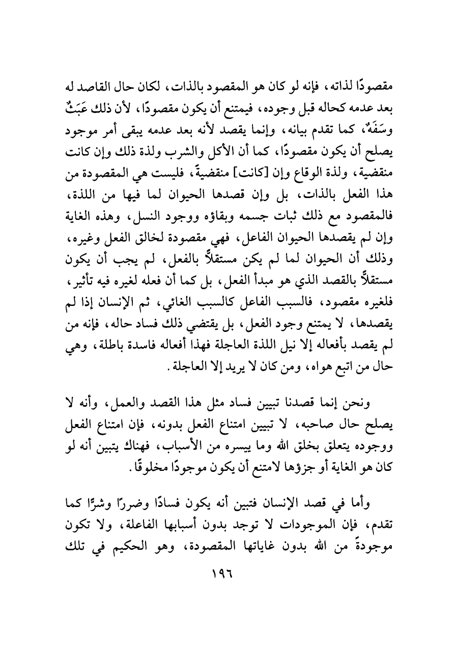 مقصودًا لذاته، فإنه لو كان هو المقصود بالذات، لكان حال القاصد له بعد عدمه كحاله قبل وجوده، فيمتنع أن يكون مقصودًا، لأن ذلك عَبَثٌ وسَفَهٌ، كما تقدم بيانه، وإنما يقصد لأنه بعد عدمه يبقى أمر موجود يصلح أن يكون مقصودًا، كما أن الأكل والشرب ولذة ذلك وإن كانت منقضية، ولذة الوقاع وإن [كانت] منقضيةً، فليست هي المقصودة من هذا الفعل بالذات، بل وإن قصدها الحيوان لما فيها من اللذة، فالمقصود مع ذلك ثبات جسمه وبقاؤه ووجود النسل، وهذه الغاية فإن لم يقصدها الحيوان الفاعل، فهي مقصودة لخالق الفعل وغيره، وذلك أن الحيوان لما لم يكن مستقلاًّ بالفعل، لم يجب أن يكون مستقلاًّ بالقصد الذي هو مبدأ الفعل، بل كما أن فعله لغيره فيه تأثير، فلغيره مقصود، فالسبب الفاعل كالسبب الغائي، ثم الإنسان إذا لم يقصدها، لا يمتنع وجود الفعل، بل يقتضي ذلك فساد حاله، فإنه من لم يقصد بأفعاله إلا نيل اللذة العاجلة فهذا أفعاله فاسدة باطلة، وهي حال من اتبع هواه، ومن كان لا يريد إلا العاجلة.