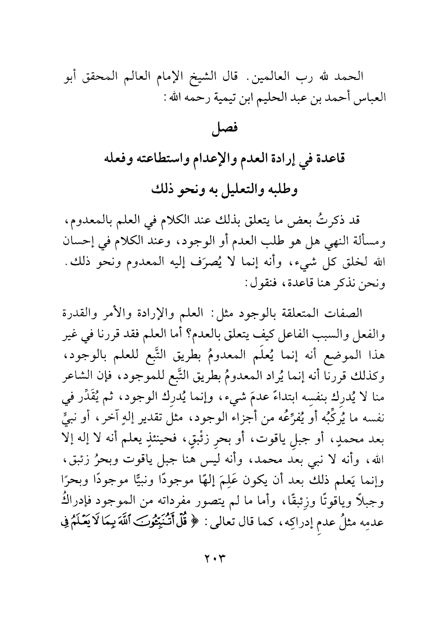 الصفات المتعلقة بالوجود مثل: العلم والإرادة والأمر والقدرة والفعل والسبب الفاعل كيف يتعلق بالعدم؟ أما العلم فقد قررنا في غير هذا الموضع أنه إنما يُعلَم المعدومُ بطريق التَّبع للعلم بالوجود، وكذلك قررنا أنه إنما يُراد المعدومُ بطريق التَّبع للموجود، فإن الشاعر منا لا يُدرِك بنفسِه ابتداءً عدمَ شيء، وإنما يُدرِك الوجود، ثم يُقَدِّر في نفسه ما يُركِّبُه أو يُفرِّعُه منَ أجزاء الوجود، مثل تقدير إلهٍ آخر، أو نبى بعد محمدٍ، أو جبلِ ياقوت، أو بحرِ زئْبقٍ، فحينئذٍ يعلم أنه لا إله إلا الله، وأنه لا نبي بعد محمد، وأنه ليس هنا جبل ياقوت وبحرُ زئبق، وإنما يَعلم ذلك بعد أن يكون عَلِمَ إلهًا موجودًا ونبيًّا موجودًا وبحرًا وجبلاً وياقوتًا وزِئبقًا، وأما ما لم يتصور مفرداته من الموجود فإدراكُ عدمِه مثلُ عدمِ إدراكِه، كما قال تعالى: (قُلْ أَتُنَبِّئُونَ اللَّهَ بِمَا لَا يَعْلَمُ فِي