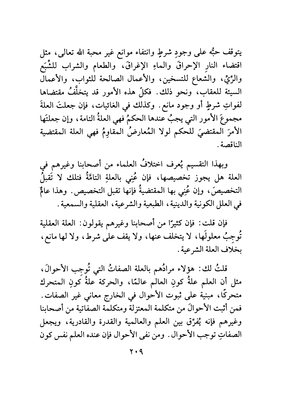 يتوقف حبه على وجودِ شرط وانتفاء موانع غير محبة الله تعالى، مثل اقتضاء النارِ الإحراقَ والماءِ الإغراقَ، والطعام والشراب للشِّبَع والرّيِّ، والشعاع للتسخين، والأعمال الصالحة للثواب، والأعمال السيئة للعقاب، ونحو ذلك. فكلّ هذه الأمور قد يتخلَّفُ مقتضاها لفواتِ شرط أو وجود مانع. وكذلك في الغائيات، فإن جعلتَ العلةَ مجموعَ الأمور التي يجبُ عندها الحكمُ فهي العلةُ التامة، وإن جعلتَها الأمرَ المقتضيَ للحكم لولا المُعارضُ المقاوِمُ فهي العلة المقتضية الناقصة.