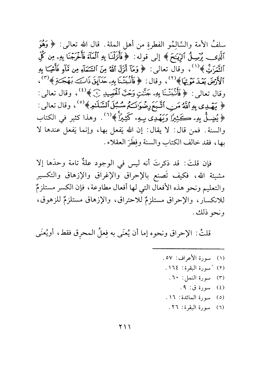 سلفُ الأمة والسَّالِمُو الفطرةِ من أهل الملة. قال الله تعالى: (وَهُوَ الَّذِي يُرْسِلُ الرِّيَاحَ) إلى قوله: (فَأَنْزَلْنَا بِهِ الْمَاءَ فَأَخْرَجْنَا بِهِ مِنْ كُلِّ الثَّمَرَاتِ) (¬١)، وقال تعالى: (وَمَا أَنْزَلَ اللَّهُ مِنَ السَّمَاءِ مِنْ مَاءٍ فَأَحْيَا بِهِ الْأَرْضَ بَعْدَ مَوْتِهَا) (¬٢)، وقال: (فَأَنْبَتْنَا بِهِ حَدَائِقَ ذَاتَ بَهْجَةٍ) (¬٣)، وقال تعالى: (فَأَنْبَتْنَا بِهِ جَنَّاتٍ وَحَبَّ الْحَصِيدِ (٩)) (¬٤)، وقال تعالى: (يَهْدِي بِهِ اللَّهُ مَنِ اتَّبَعَ رِضْوَانَهُ سُبُلَ السَّلَام) (¬٥)، وقال تعالى: (يُضِلُّ بِهِ كَثِيرًا وَيَهْدِي بِهِ كَثِيرًا) (¬٦). وهذا كثير في الكتاب والسنة. فمن قال: لا يقال: إن الله يَفعل بها، وإنما يَفعل عندها لا بها، فقد خالف الكتاب والسنة وفِطَرَ العقلاء.