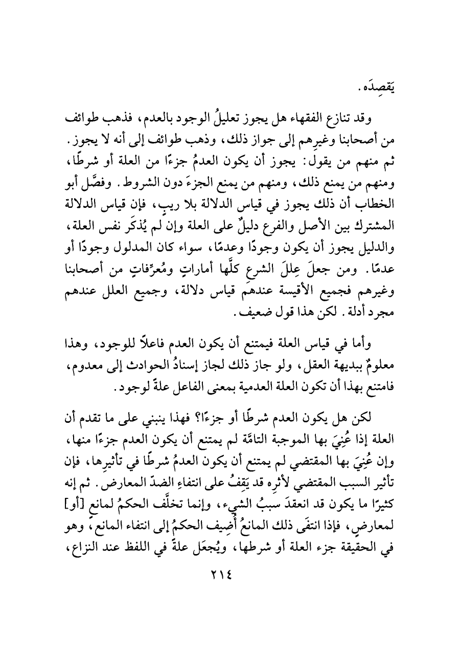 لكن هل يكون العدم شرطًا أو جزءًا؟ فهذا ينبني على ما تقدم أن العلة إذا عُنِيَ بها الموجبة التامَّة لم يمتنع أن يكون العدم جزءاً منها، وإن عُنِيَ بها المقتضي لم يمتنع أن يكون العدمُ شرطا في تأثيرِها، فإن تأثير السبب المقتضي لأثرِه قد يَقِفُ على انتفاءِ الضدّ المعارض. ثم إنه كثيرًا ما يكون قد انعقدَ سببُ الشيء، وإنما تخلف الحكمُ لمانعٍ [أو] لمعارضٍ، فإذا انتفَى ذلك المانعُ أضِيف الحكمُ إلى انتفاء المانع، وهو في الحقيقة جزء العلة أو شرطها، ويُجعَل علةً في اللفظ عند النزاع،