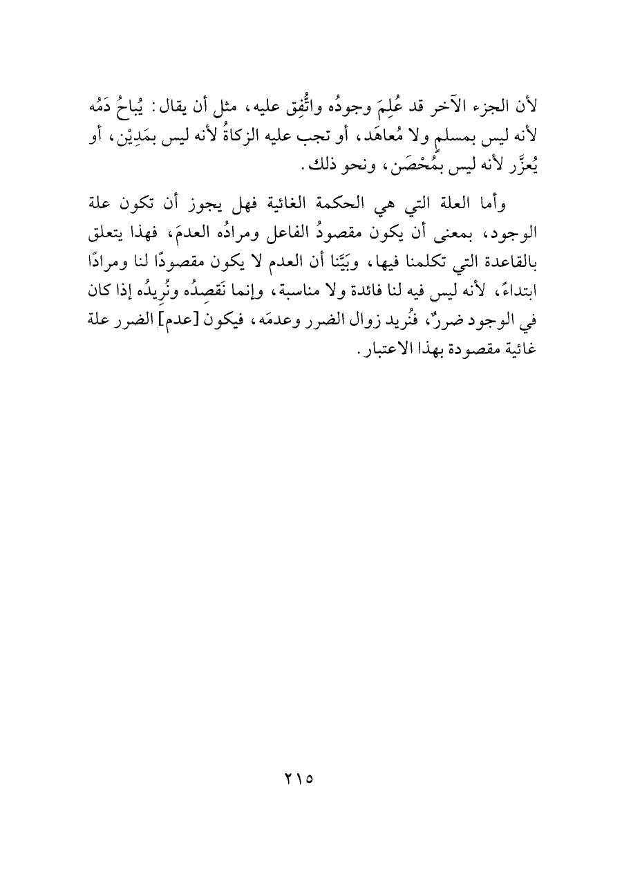 وأما العلة التي هي الحكمة الغائية فهل يجوز أن تكون علة الوجود، بمعنى أن يكون مقصودُ الفاعل ومرادُه العدمَ، فهذا يتعلق بالقاعدة التي تكلمنا فيها، وبَيَّنا أن العدم لا يكون مقصودًا لنا ومرادًا ابتداءً، لأنه ليس فيه لنا فائدة ولا مناسبة، وإنما نَقصِدُه ونُرِيدُه إذا كان في الوجود ضررٌ، فنُريد زوال الضرر وعدمَه، فيكون [عدم] الضرر علة غائية مقصودة بهذا الاعتبار.