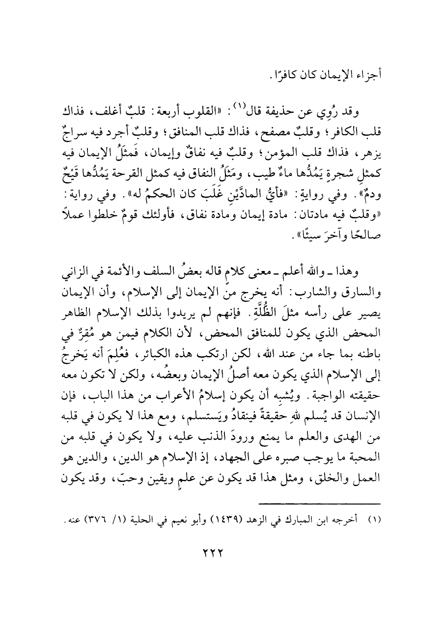 وقد رُوِي عن حذيفة قال (¬١): "القلوب أربعة: قلبٌ أغلف، فذاك قلب الكافر؟ وقلبٌ مصفح، فذاك قلب المنافق؟ وقلبٌ أجرد فيه سراج يزهر، فذاك قلب المؤمن؟ وقلب فيه نفاق وإيمان، فَمثَلُ الإيمان فيه كمثلِ شجرةٍ يَمُدُّها ماءٌ طيب، ومَثَلُ النفاق فيه كمثل القرحة يَمُدُّها قَيْحٌ ودمٌ ". وفي روايةٍ: "فأيُّ المادَّيْنِ غَلَبَ كان الحكمُ له ". وفي رواية: "وقلبٌ فيه مادتان: مادة إيمان ومادة نفاق، فأولئك قومٌ خلطوا عملاً صالحًا وآخرَ سيئًا".