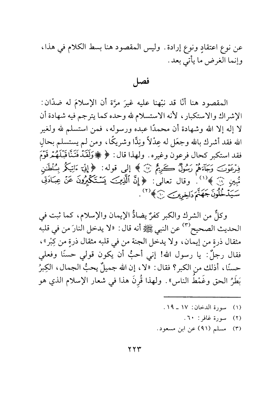 المقصود هنا أنّا قد نبّهنا عليه غيرَ مرَّة أن الإسلامَ له ضدّان: الإشراك والاستكبار، لأنه الاستسلام لله وحده كما يترجم فيه شهادة أن لا إله إلا الله وشهادة أن محمدًا عبده ورسوله، فمن استسلم لله ولغير الله فقد أشرك بالله وجعَل له عِدْلاً وندًّا وشريكًا، ومن لم يستسلم بحالٍ فقد استكبر كحال فرعون وغيره. ولهذا قال: (وَلَقَدْ فَتَنَّا قَبْلَهُمْ قَوْمَ فِرْعَوْنَ وَجَاءَهُمْ رَسُولٌ كَرِيمٌ (١٧)) إلى قوله: (إِنِّي آَتِيكُمْ بِسُلْطَانٍ مُبِينٍ (١٩)) (¬١). وقال تعالى: (إِنَّ الَّذِينَ يَسْتَكْبِرُونَ عَنْ عِبَادَتِي سَيَدْخُلُونَ جَهَنَّمَ دَاخِرِينَ (٦٠)) (¬٢).