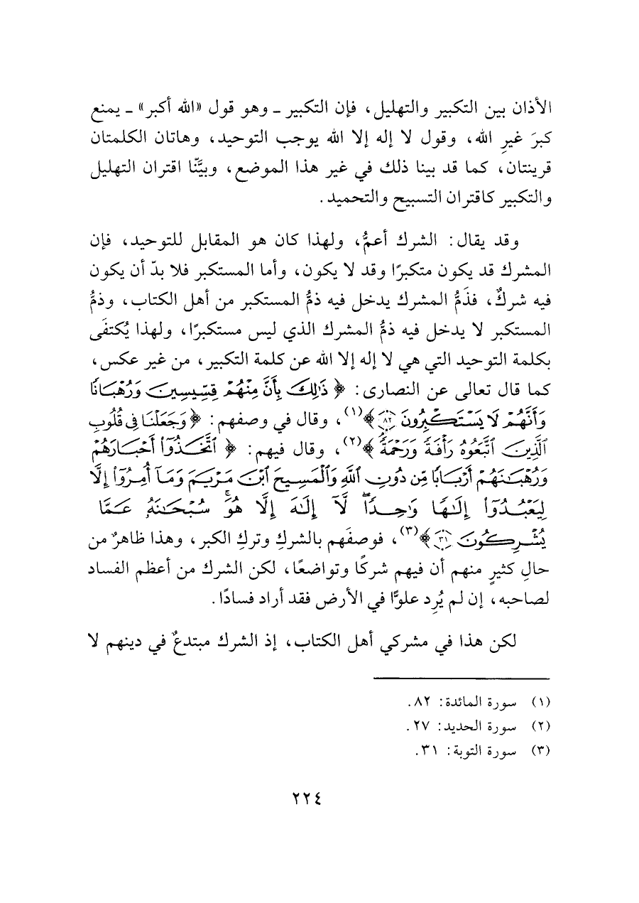 وقد يقال: الشرك أعمُّ، ولهذا كان هو المقابل للتوحيد، فإن المشرك قد يكون متكبرًا وقد لا يكون، وأما المستكبر فلا بدّ أن يكون فيه شرك، فذَمُّ المشرك يدخل فيه ذمُّ المستكبر من أهل الكتاب، وذمُّ المستكبر لا يدخل فيه ذمُّ المشرك الذي ليس مستكبرًا، ولهذا يُكتفَى بكلمة التوحيد التي هي لا إله إلا الله عن كلمة التكبير، من غير عكس، كما قال تعالى عن النصارى: (ذَلِكَ بِأَنَّ مِنْهُمْ قِسِّيسِينَ وَرُهْبَانًا وَأَنَّهُمْ لَا يَسْتَكْبِرُونَ (٨٢)) (¬١)، وقال في وصفهم: (وَجَعَلْنَا فِي قُلُوبِ الَّذِينَ اتَّبَعُوهُ رَأْفَةً وَرَحْمَةً) (¬٢)، وقال فيهم: (اتَّخَذُوا أَحْبَارَهُمْ وَرُهْبَانَهُمْ أَرْبَابًا مِنْ دُونِ اللَّهِ وَالْمَسِيحَ ابْنَ مَرْيَمَ وَمَا أُمِرُوا إِلَّا لِيَعْبُدُوا إِلَهًا وَاحِدًا لَا إِلَهَ إِلَّا هُوَ سُبْحَانَهُ عَمَّا يُشْرِكُونَ (٣١)) (¬٣)، فوصفَهم بالشركِ وتركِ الكبر، وهذا ظاهرٌ من حالِ كثيرٍ منهم أن فيهم شركًا وتواضعًا، لكن الشرك من أعظم الفساد لصاحبه، إن لم يُرِد علوًّا في الأرض فقد أراد فسادًا.
