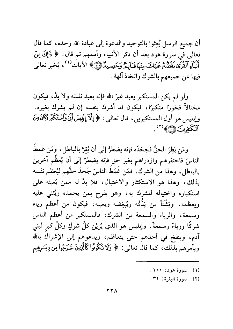 ولو لم يكن المستكبر يعبد غيرَ الله فإنه يعبد نفسَه ولا بدَّ، فيكون مختالاً فخورًا متكبرًا، فيكون قد أشرك بنفسه إن لم يشرك بغيره. وإبليس هو أول المستكبرين، قال تعالى: (إِلَّا إِبْلِيسَ أَبَى وَاسْتَكْبَرَ وَكَانَ مِنَ الْكَافِرِينَ (٣٤)) (¬٢).