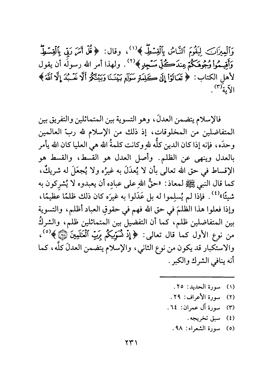 فالإسلام يتضمن العدلَ، وهو التسوية بين المتماثلين والتفريق بين المتفاضلين من المخلوقات، إذ ذلك من الإسلام لله ربّ العالمين وحدَه، فإنه إذا كان الدين كله للهِ وكانت كلمةُ الله هي العليا كان الله يأمر بالعدل وينهى عن الظلم. وأصل العدل هو القسط، والقسط هو الإقساط في حق الله تعالى بان لا يُعدَلَ به غيرُه ولا يُجعَلَ له شريك، كما قال النبي - صَلَّى اللَّهُ عَلَيْهِ وَسَلَّمَ - لمعاذ: "حقُّ اللهِ على عبادِه أن يعبدوه لا يُشرِكون به شيئا" (¬٤). فإذا لم يُسلِموا له بل عَدَلوا به غيرَه كان ذلك ظلمًا عظيمًا، وإذا فعلوا هذا الظلمَ في حق الله فهم في حقوقِ العباد أظلم، والتسوية بين المتفاضلين ظلم، كما أن التفضيل بين المتماثلين ظلم، والشركُ من نوع الأول كما قال تعالى: (إِذْ نُسَوِّيكُمْ بِرَبِّ الْعَالَمِينَ (٩٨)) (¬٥)، والاستكبار قد يكون من نوع الثاني، والإسلام يتضمن العدلَ كلَّه، كما أنه ينافي الشرك والكبر.