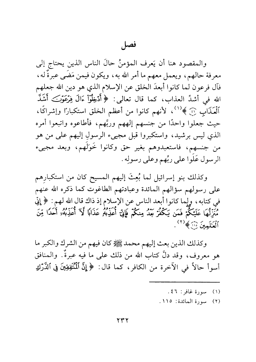 والمقصود هنا أن يَعرف المؤمنُ حالَ الناس الذينِ يحتاج إلى معرفة حالهم، ويعمل معهم ما أمر الله به، ويكون فيمن مَضى عبرةٌ له، فآل فرعون لما كانوا أبعدَ الخلق عن الإسلام الذي هو دين الله جعلهم الله في أشدِّ العذاب، كما قال تعالى: (أَدْخِلُوا آَلَ فِرْعَوْنَ أَشَدَّ الْعَذَابِ (٤٦)) (¬١)، لأنهم كانوا من أعظم الخلق استكبارًا وإشراكًا، حيث جعلوا واحدًا من جنسهم إلههم وربَّهم، فأطاعوه واتبعوا أمره الذي ليس برشيد، واستكبروا قبل مجيئ الرسولِ إليهم على من هو من جنسهم، فاستعبدوهم بغير حق وكانوا خَوَلَهم، وبعد مجيئ الرسول عَلَوا على ربِّهم وعلى رسوله.
