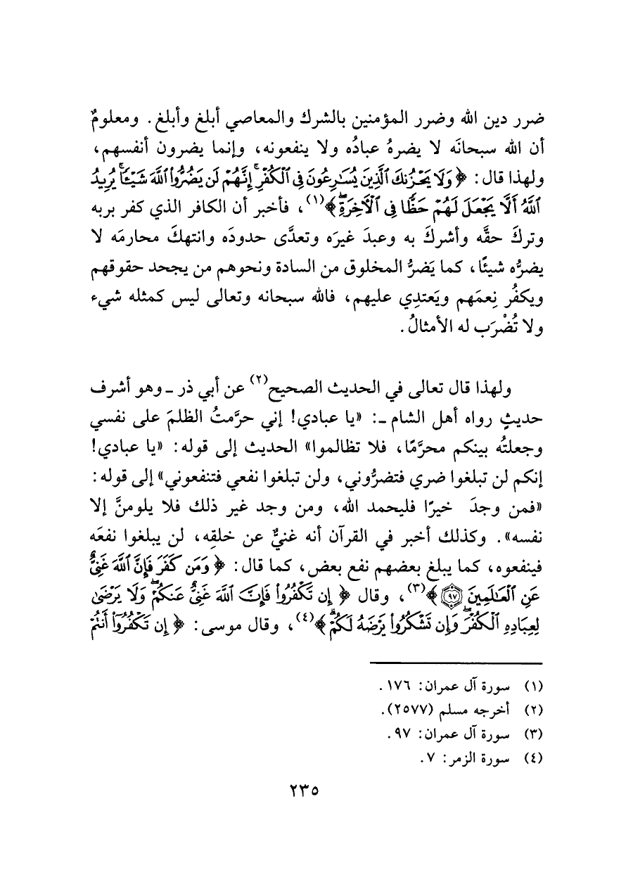 ضرر دين الله وضرر المؤمنين بالشرك والمعاصي أبلغ وأبلغ. ومعلوم أن الله سبحانَه لا يضرهُ عبادُه ولا ينفعونه، وإنما يضرون أنفسهم، ولهذا قال: (وَلَا يَحْزُنْكَ الَّذِينَ يُسَارِعُونَ فِي الْكُفْرِ إِنَّهُمْ لَنْ يَضُرُّوا اللَّهَ شَيْئًا يُرِيدُ اللَّهُ أَلَّا يَجْعَلَ لَهُمْ حَظًّا فِي الْآَخِرَةِ) (¬١)، فأخبر أن الكافر الذي كفر بربه وتركَ حقَّه وأشركَ به وعبدَ غيرَه وتعدَّى حدودَه وانتهكَ محارمَه لا يضرُّه شيئا، كما يَضرُّ المخلوق من السادة ونحوهم من يجحد حقوقهم ويكفُر نِعمَهم ويَعتدِي عليهم، فالله سبحانه وتعالى ليس كمثله شيء ولا تُضْرَب له الأمثالُ.