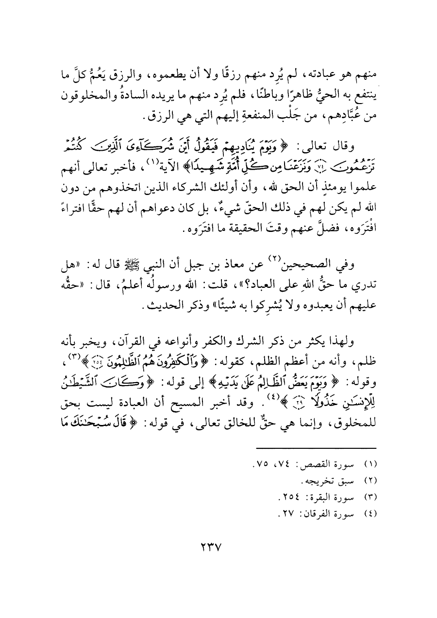 ولهذا يكثر من ذكر الشرك والكفر وأنواعه في القرآن، ويخبر بأنه ظلم، وأنه من أعظم الظلم، كقوله: (وَالْكَافِرُونَ هُمُ الظَّالِمُونَ (٢٥٤)) " (¬٣)، وقوله: (وَيَوْمَ يَعَضُّ الظَّالِمُ عَلَى يَدَيْهِ) إلى قوله: (وَكَانَ الشَّيْطَانُ لِلْإِنْسَانِ خَذُولًا (٢٩)) (¬٤). وقد أخبر المسيح أن العبادة ليست بحق للمخلوق، وإنما هي حقّ للخالق تعالى، في قوله: (قَالَ سُبْحَانَكَ مَا