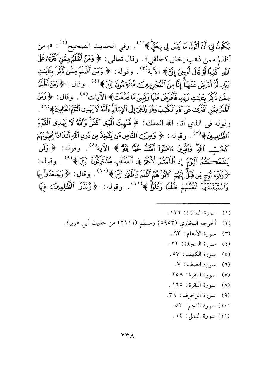 يَكُونُ لِي أَنْ أَقُولَ مَا لَيْسَ لِي بِحَقٍّ) (¬١). وفي الحديث الصحيح (¬٢): "ومن أظلمُ ممن ذهب يخلق كخلقي ". وقال تعالى: (وَمَنْ أَظْلَمُ مِمَّنِ افْتَرَى عَلَى اللَّهِ كَذِبًا أَوْ قَالَ أُوحِيَ إِلَيَّ) الآية (¬٣). وقوله: (وَمَنْ أَظْلَمُ مِمَّنْ ذُكِّرَ بِآَيَاتِ رَبِّهِ ثُمَّ أَعْرَضَ عَنْهَا إِنَّا مِنَ الْمُجْرِمِينَ مُنْتَقِمُونَ (٢٢)) (¬٤). وقال: (وَمَنْ أَظْلَمُ مِمَّنْ ذُكِّرَ بِآَيَاتِ رَبِّهِ فَأَعْرَضَ عَنْهَا وَنَسِيَ مَا قَدَّمَتْ) الآيات (¬٥). وقال: (وَمَنْ أَظْلَمُ مِمَّنِ افْتَرَى عَلَى اللَّهِ الْكَذِبَ وَهُوَ يُدْعَى إِلَى الْإِسْلَامِ وَاللَّهُ لَا يَهْدِي الْقَوْمَ الظَّالِمِين (¬٦)).