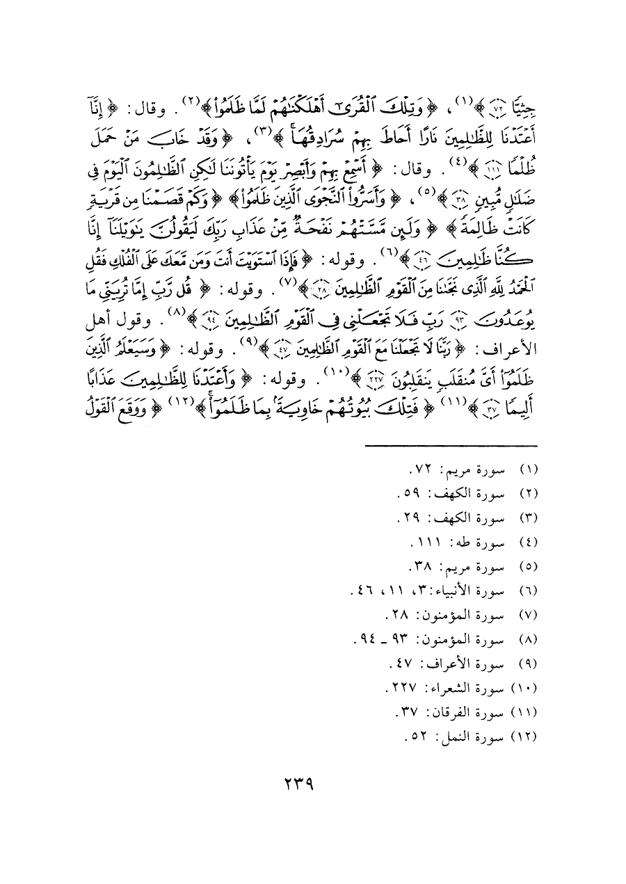 جِثِيًّا (٧٢)) (¬١)، (وَتِلْكَ الْقُرَى أَهْلَكْنَاهُمْ لَمَّا ظَلَمُوا) (¬٢). وقال: (إِنَّا أَعْتَدْنَا لِلظَّالِمِينَ نَارًا أَحَاطَ بِهِمْ سُرَادِقُهَا) (¬٣)، (وَقَدْ خَابَ مَنْ حَمَلَ ظُلْمًا (١١١)) (¬٤). وقال: (أَسْمِعْ بِهِمْ وَأَبْصِرْ يَوْمَ يَأْتُونَنَا لَكِنِ الظَّالِمُونَ الْيَوْمَ فِي ضَلَالٍ مُبِينٍ (٣٨)) (¬٥)، (وَأَسَرُّوا النَّجْوَى الَّذِينَ ظَلَمُوا) (وَكَمْ قَصَمْنَا مِنْ قَرْيَةٍ كَانَتْ ظَالِمَةً) (وَلَئِنْ مَسَّتْهُمْ نَفْحَةٌ مِنْ عَذَابِ رَبِّكَ لَيَقُولُنَّ يَا وَيْلَنَا إِنَّا كُنَّا ظَالِمِينَ (٤٦)) (¬٦). وقوله: (فَإِذَا اسْتَوَيْتَ أَنْتَ وَمَنْ مَعَكَ عَلَى الْفُلْكِ فَقُلِ الْحَمْدُ لِلَّهِ الَّذِي نَجَّانَا مِنَ الْقَوْمِ الظَّالِمِينَ (٢٨)) (¬٧). وقوله: (قُلْ رَبِّ إِمَّا تُرِيَنِّي مَا يُوعَدُونَ (٩٣) رَبِّ فَلَا تَجْعَلْنِي فِي الْقَوْمِ الظَّالِمِينَ (٩٤)) (¬٨). وقول أهل الأعراف: (رَبَّنَا لَا تَجْعَلْنَا مَعَ الْقَوْمِ الظَّالِمِينَ (٤٧)) (¬٩). وقوله: (وَسَيَعْلَمُ الَّذِينَ ظَلَمُوا أَيَّ مُنْقَلَبٍ يَنْقَلِبُونَ (٢٢٧)) (¬١٠). وقوله: (وَأَعْتَدْنَا لِلظَّالِمِينَ عَذَابًا أَلِيمًا (٣٧)) (¬١١) (فَتِلْكَ بُيُوتُهُمْ خَاوِيَةً بِمَا ظَلَمُوا) (¬١٢) (وَوَقَعَ الْقَوْلُ
