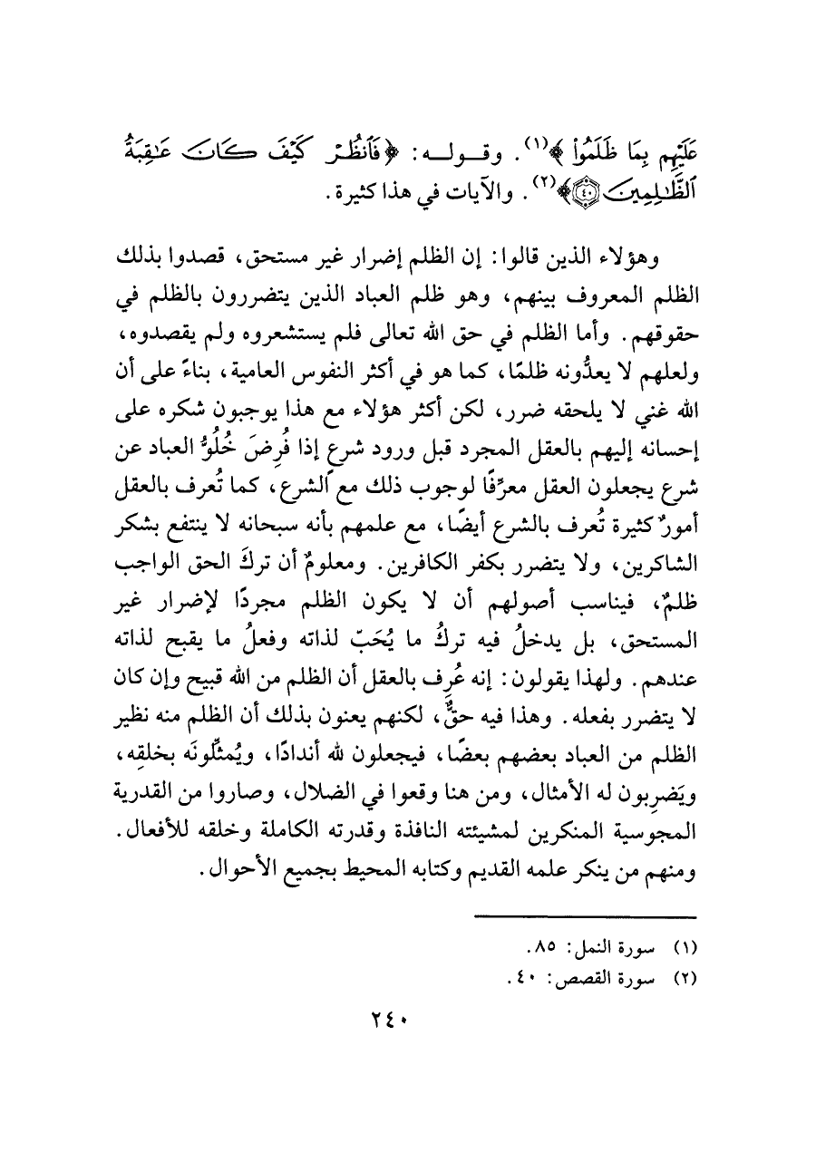 وهؤلاء الذين قالوا: إن الظلم إضرار غير مستحق، قصدوا بذلك الظلم المعروف بينهم، وهو ظلم العباد الذين يتضررون بالظلم في حقوقهم. وأما الظلم في حق الله تعالى فلم يستشعروه ولم يقصدوه، ولعلهم لا يعدُّونه ظلمًا، كما هو في أكثر النفوس العامية، بناءً على أن الله غني لا يلحقه ضرر، لكن أكثر هؤلاء مع هذا يوجبون شكره على إحسانه إليهم بالعقل المجرد قبل ورود شرع إذا فُرِضَ خُلُوُّ العباد عن شرع يجعلون العقل معرِّفًا لوجوب ذلك معً الشرع، كما تُعرف بالعقل أمورٌ كثيرة تُعرف بالشرع أيضًا، مع علمهم بأنه سبحانه لا ينتفع بشكر الشاكرين، ولا يتضرر بكفر الكافرين. ومعلومٌ أن تركَ الحق الواجب ظلمٌ، فيناسب أصولهم أن لا يكون الظلم مجردًا لإضرار غير المستحق، بل يدخلُ فيه تركُ ما يُحَبّ لذاته وفعلُ ما يقبح لذاته عندهم. ولهذا يقولون: إنه عُرِف بالعقل أن الظلم من الله قبيح وإن كان لا يتضرر بفعله. وهذا فيه حقٌّ، لكنهم يعنون بذلك أن الظلم منه نظير الظلم من العباد بعضهم بعضًا، فيجعلون لله أندادًا، ويُمثلونَه بخلقِه، ويَضرِبون له الأمثال، ومن هنا وقعوا في الضلال، وصاروا من القدرية المجوسية المنكرين لمشيئته النافذة وقدرته الكاملة وخلقه للأفعال. ومنهم من ينكر علمه القديم وكتابه المحيط بجميع الأحوال.