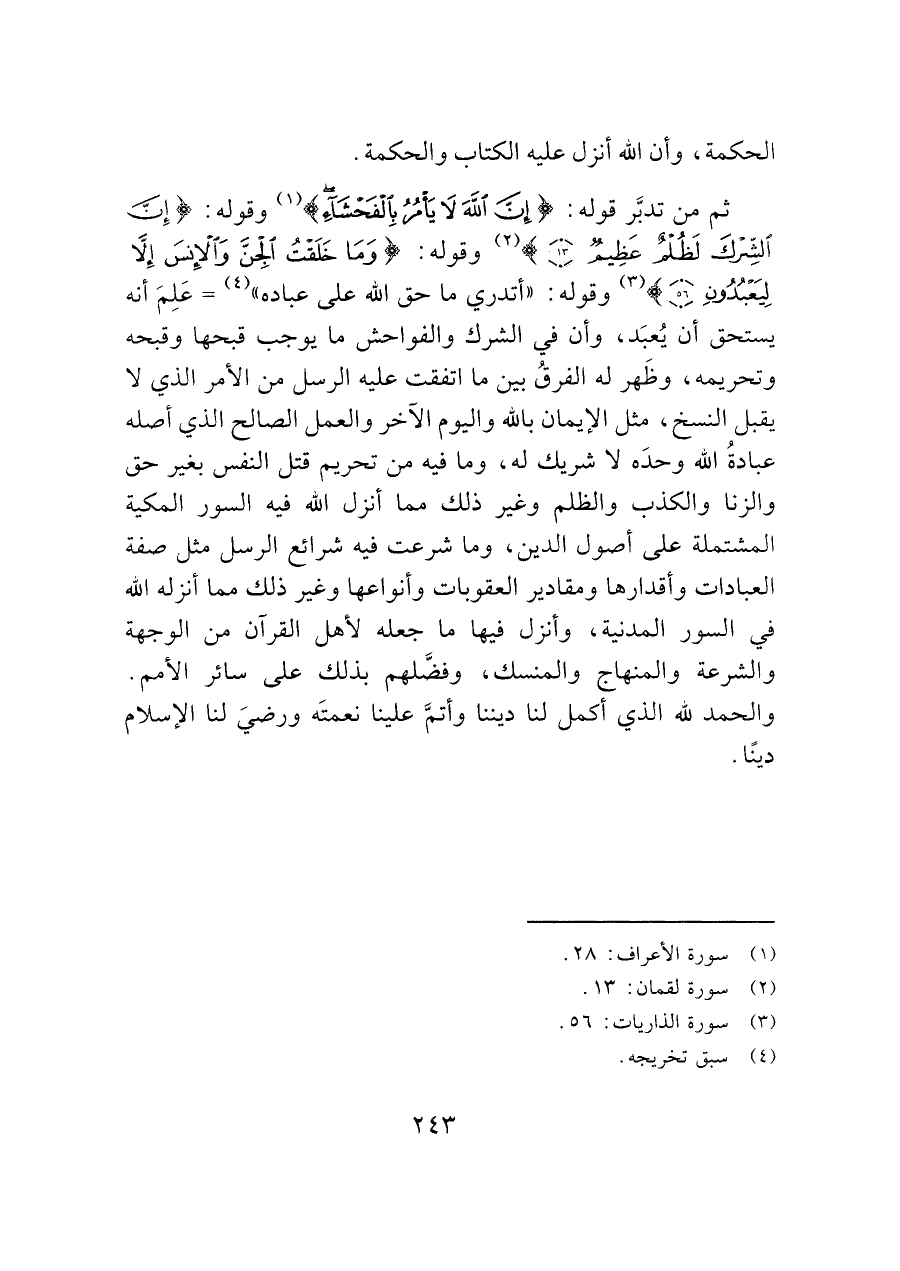 ثم من تدبَّر قوله: (إِنَّ اللَّهَ لَا يَأْمُرُ بِالْفَحْشَاءِ) (¬١) وقوله: (إِنَّ الشِّرْكَ لَظُلْمٌ عَظِيمٌ (١٣)) (¬٢) وقوله: (وَمَا خَلَقْتُ الْجِنَّ وَالْإِنْسَ إِلَّا لِيَعْبُدُونِ (٥٦)) (¬٣) وقوله: "أتدري ما حق الله على عباده " (¬٤) = عَلِمَ أنه يستحق أن يُعبَد، وأن في الشرك والفواحش ما يوجب قبحها وقبحه وتحريمه، وظَهر له الفرقُ بين ما اتفقت عليه الرسل من الأمر الذي لا يقبل النسخ، مثل الإيمان بالله واليوم الآخر والعمل الصالح الذي أصله عبادةُ الله وحدَه لا شريك له، وما فيه من تحريم قتل النفس بغير حق والزنا والكذب والظلم وغير ذلك مما أنزل الله فيه السور المكية المشتملة على أصول الدين، وما شرعت فيه شرائع الرسل مثل صفة العبادات وأقدارها ومقادير العقوبات وأنواعها وغير ذلك مما أنزله الله في السور المدنية، وأنزل فيها ما جعله لأهل القرآن من الوجهة والشرعة والمنهاج والمنسك، وفضَّلهم بذلك على سائر الأمم. والحمد لله الذي أكمل لنا ديننا وأتمَّ علينا نعمتَه ورضيَ لنا الإسلام دينًا.