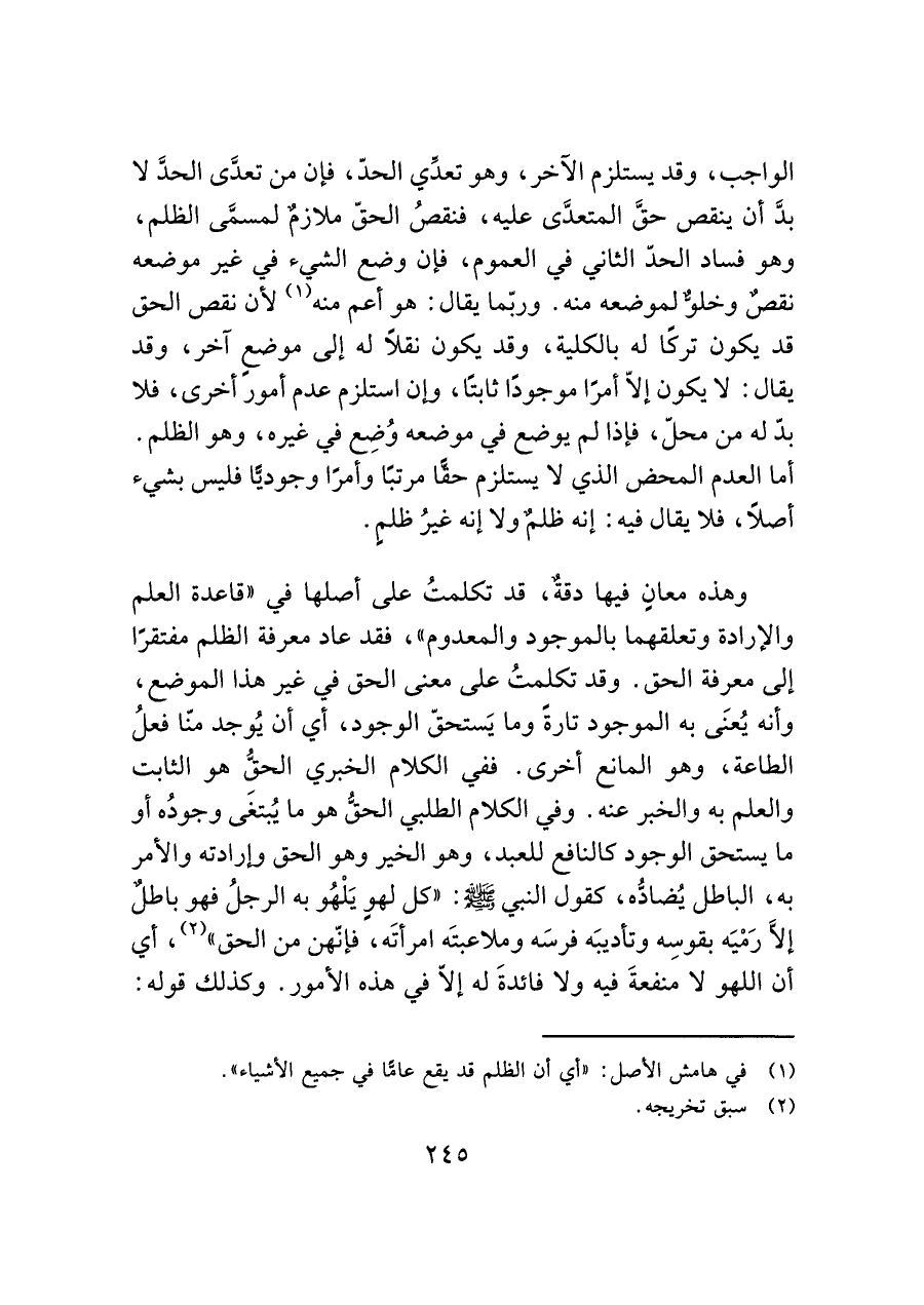 وهذه معانٍ فيها دقةٌ، قد تكلمتُ على أصلها في "قاعدة العلم والإرادة وتعلقهما بالموجود والمعدوم "، فقد عاد معرفة الظلم مفتقرًا إلى معرفة الحق. وقد تكلمتُ على معنى الحق في غير هذا الموضع، وأنه يُعنَى به الموجود تارةً وما يَستحقّ الوجود، أي أن يُوجد منا فعلُ الطاعة، وهو المانع أخرى. ففي الكلام الخبري الحقُّ هو الثابت والعلم به والخبر عنه. وفي الكلام الطلبي الحقُّ هو ما يُبتغى وجودُه أو ما يستحق الوجود كالنافع للعبد، وهو الخير وهو الحق وإرادته والأمر به، الباطل يُضادُّه، كقول النبي - صَلَّى اللَّهُ عَلَيْهِ وَسَلَّمَ -: " كل لهوٍ يَلْهُو به الرجلُ فهو باطلٌ إلأَ رَمْيَه بقوسِه وتأديبَه فرسَه وملاعبتَه امرأتَه، فإنّهن من الحق" (¬٢)، أي أن اللهو لا منفعةَ فيه ولا فائدةَ له إلاّ في هذه الأمور. وكذلك قوله: