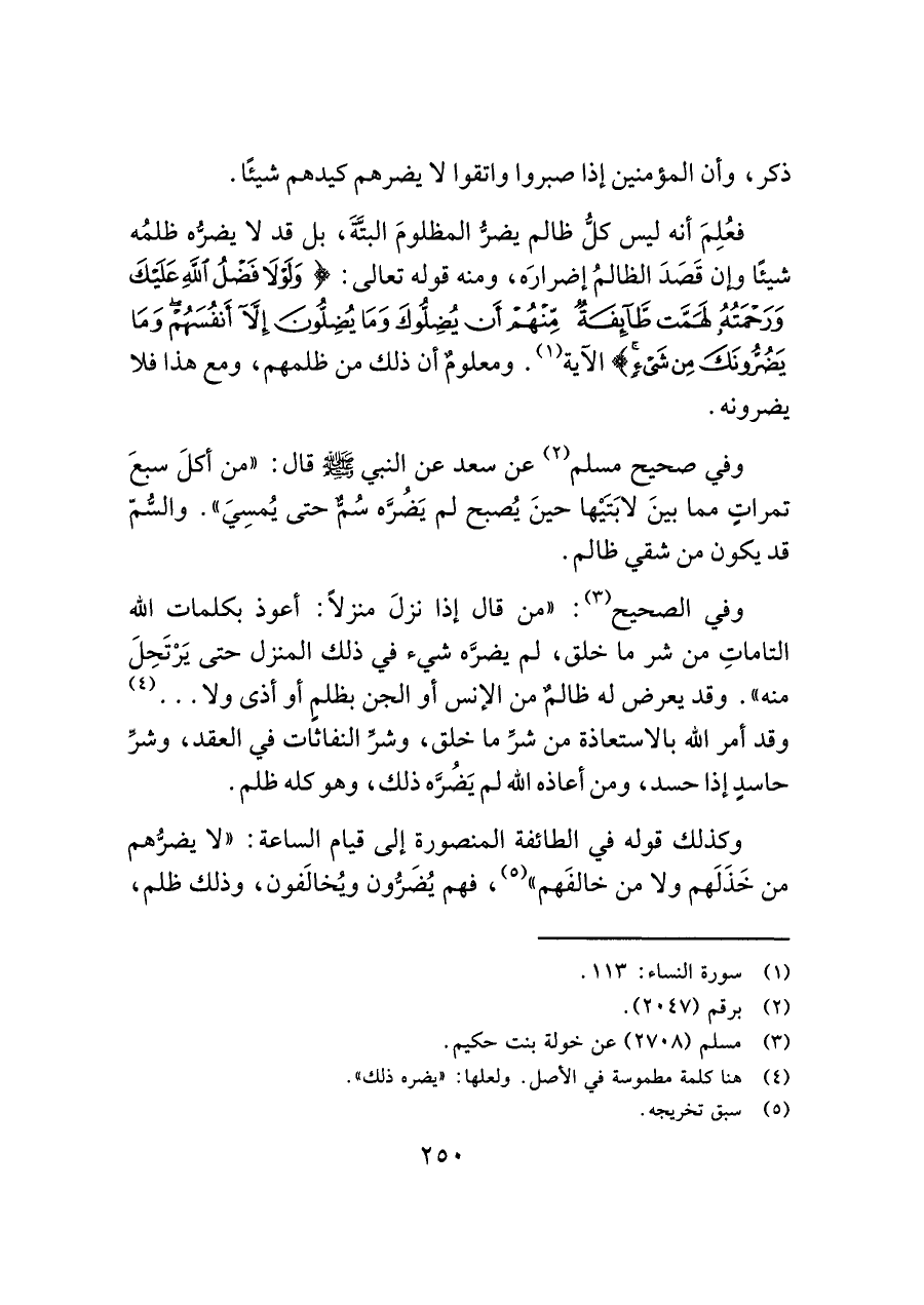 فعُلِمَ أنه ليس كلُّ ظالم يضرُّ المظلومَ البتةَ، بل قد لا يضرُّه ظلمُه شيئًا وإن قَصَدَ الظالمُ إضرارَه، ومنه قوله تعالى: (وَلَوْلَا فَضْلُ اللَّهِ عَلَيْكَ وَرَحْمَتُهُ لَهَمَّتْ طَائِفَةٌ مِنْهُمْ أَنْ يُضِلُّوكَ وَمَا يُضِلُّونَ إِلَّا أَنْفُسَهُمْ وَمَا يَضُرُّونَكَ مِنْ شَيْءٍ) الآية (¬١). ومعلومٌ أن ذلك من ظلمهم، ومع هذا فلا يضرونه.