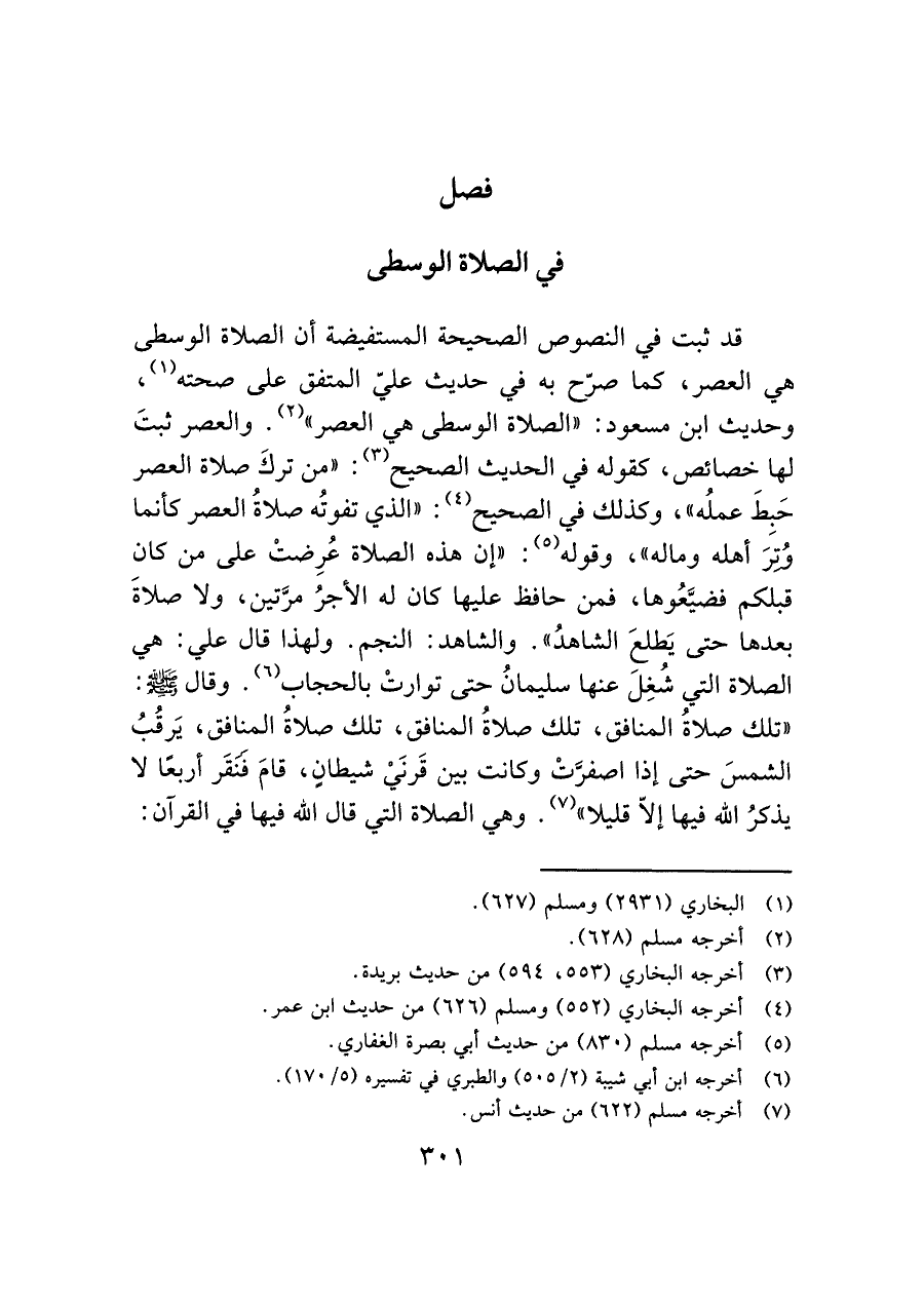 قد ثبت في النصوص الصحيحة المستفيضة أن الصلاة الوسطى هي العصر، كما صرّح به في حديث عليّ المتفق على صحته (¬١)، وحديث ابن مسعود: "الصلاة الوسطى هي العصر" (¬٢). والعصر ثبتَ لها خصائص، كقوله في الحديث الصحيح (¬٣): "من تركَ صلاة العصر حَبطَ عملُه"، وكذلك في الصحيح (¬٤): "الذي تفوتُه صلاةُ العصر كأنما وُترَ أهله وماله"، وقوله (¬٥): "إن هذه الصلاة عُرِضتْ على من كان قبلكم فضيَّعُوها، فمن حافظ عليها كان له الأجرُ مرَّتين، ولا صلاةَ بعدها حتى يَطلعَ الشاهدُ". والشاهد: النجم. ولهذا قال علي: هي الصلاة التي شُغِلَ عنها سليمانُ حتى توارتْ بالحجاب (¬٦). وقال - صَلَّى اللَّهُ عَلَيْهِ وَسَلَّمَ -: "تلك صلاةُ المنافق، تلك صلاةُ المنافق، تلك صلاةُ المنافق، يَرقُبُ الشمسَ حتى إذا اصفرَّتْ وكانت بين قَرنَيْ شيطانٍ، قامَ فنقَر أربعًا لا يذكرُ الله فيها إلا قليلا" (¬٧). وهي الصلاة التي قال الله فيها في القرآن:
