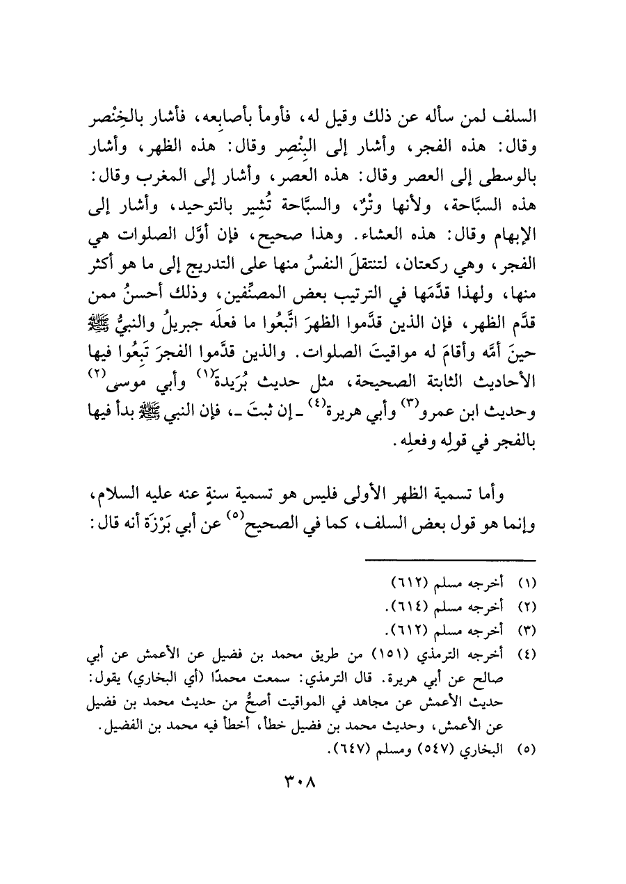السلف لمن سأله عن ذلك وقيل له، فأومأ بأصابعه، فأشار بالخِنْصر وقال: هذه الفجر، وأشار إلى البنْصِر وقال: هذه الظهر، وأشار بالوسطى إلى العصر وقال: هذه العَصر، وأشار إلى المغرب وقال: هذه السبَّاحة، ولأنها وتْرٌ، والسبَّاحة تُشِير بالتوحيد، وأشار إلى الإبهام وقال: هذه العشاء. وهذا صحيح، فإن أوَّل الصلوات هي الفجر، وهي ركعتان، لتنتقلَ النفسُ منها على التدريج إلى ما هو أكثر منها، ولهذا قدَّمَها في الترتيب بعض المصنِّفين، وذلك أحسنُ ممن قدَّم الظهر، فإن الذين قدَّموا الظهرَ اتَّبعُوا ما فعلَه جبريلُ والنبيُّ - صَلَّى اللَّهُ عَلَيْهِ وَسَلَّمَ - حينَ أمَّه وأقامَ له مواقيتَ الصلوات. والذين قدَّموا الفجرَ تَبِعُوا فيها الأحاديث الثابتة الصحيحة، مثل حديث بُرَيدة (¬١) وأبي موسى (¬٢) وحديث ابن عمرو (¬٣) وأبي هريرة (¬٤) -إن ثبتَ-، فإن النبي - صَلَّى اللَّهُ عَلَيْهِ وَسَلَّمَ - بدأ فيها بالفجر في قوله وفعلِه.
