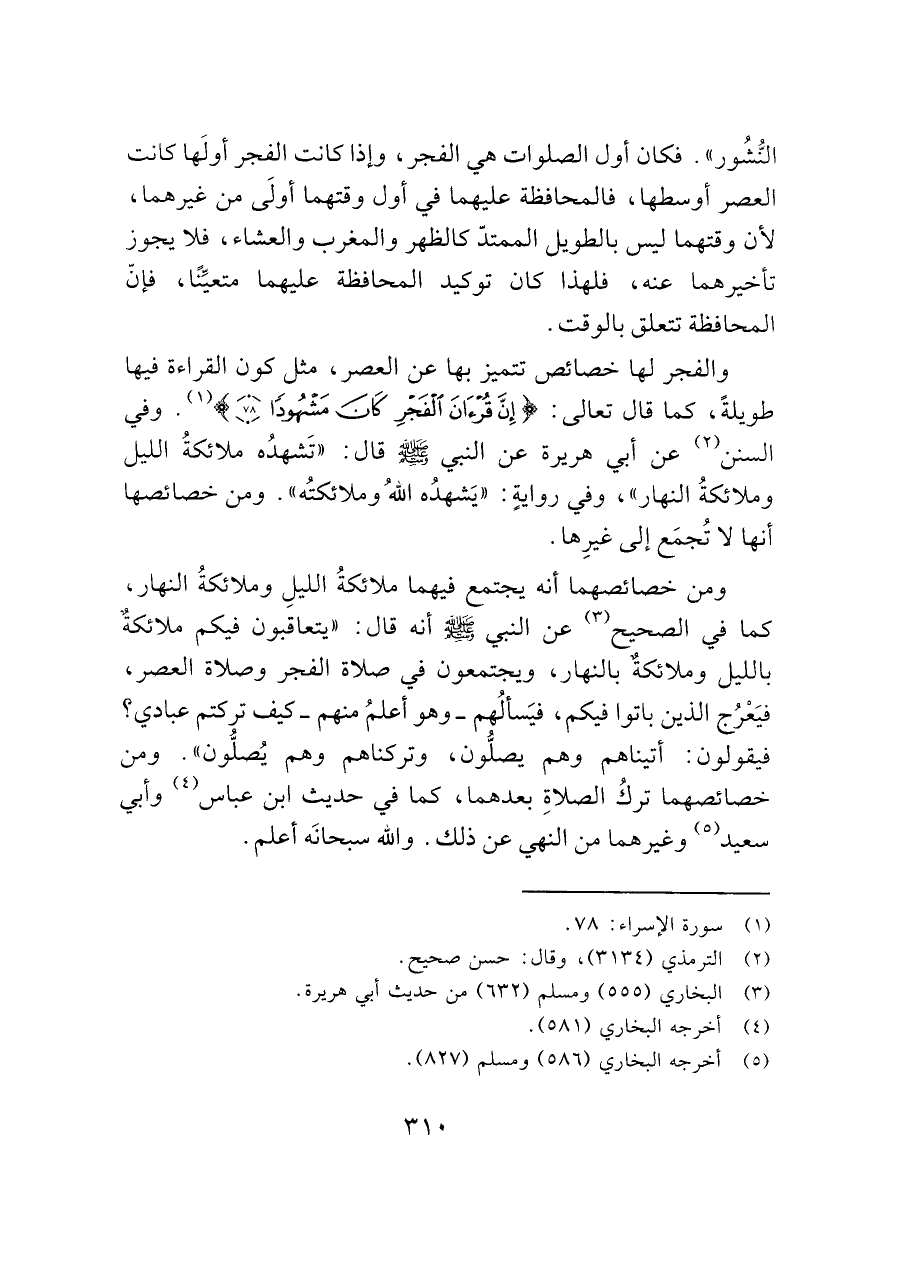 والفجر لها خصائص تتميز بها عن العصر، مثل كون القراءة فيها طويلةً، كما قال تعالى: (إِنَّ قُرْآَنَ الْفَجْرِ كَانَ مَشْهُودًا (٧٨)) (¬١). وفي السنن (¬٢) عن أبي هريرة عن النبي - صَلَّى اللَّهُ عَلَيْهِ وَسَلَّمَ - قال: "تَشهدُه ملائكةُ الليل وملائكةُ النهار"، وفي روايةٍ: "يَشهدُه الله وملائكتُه". ومن خصائصها أنها لا تُجمَع إلى غيرِها.