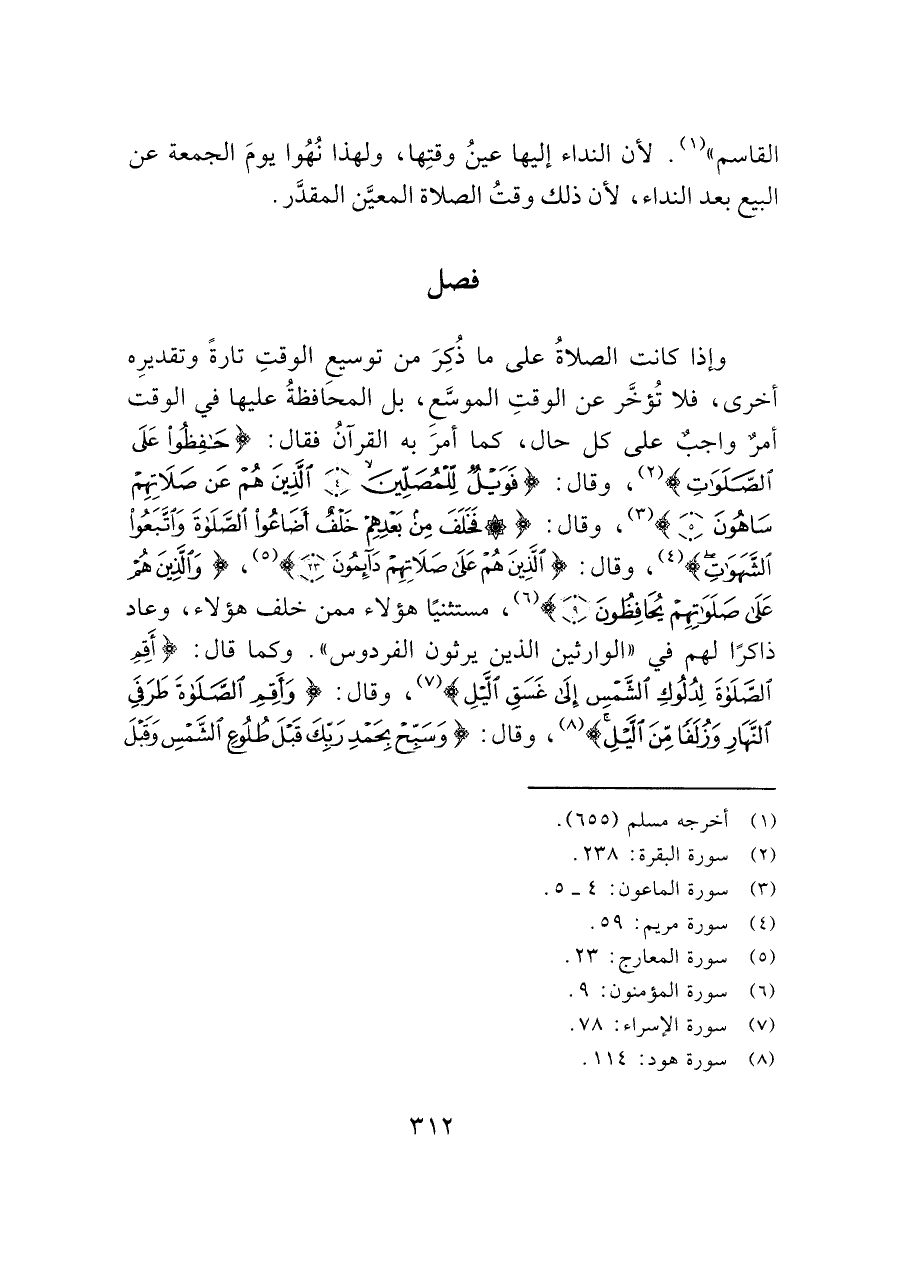 وإذا كانت الصلاةُ على ما ذُكِرَ من توسيع الوقتِ تارةً وتقديرِه أخرى، فلا تُؤخَّر عن الوقتِ الموسَّع، بل المحَافظةُ عليها في الوقت أمر واجبٌ على كل حال، كما أمر به القرآنُ فقال: (حَافِظُوا عَلَى الصَّلَوَاتِ) (¬٢)، وقال: (فَوَيْلٌ لِلْمُصَلِّينَ (٤) الَّذِينَ هُمْ عَنْ صَلَاتِهِمْ سَاهُونَ (٥)) (¬٣)، وقال: (فَخَلَفَ مِنْ بَعْدِهِمْ خَلْفٌ أَضَاعُوا الصَّلَاةَ وَاتَّبَعُوا الشَّهَوَاتِ) (¬٤)، وقال: (الَّذِينَ هُمْ عَلَى صَلَاتِهِمْ دَائِمُونَ (٢٣)) (¬٥)، (وَالَّذِينَ هُمْ عَلَى صَلَوَاتِهِمْ يُحَافِظُونَ (٩)) (¬٦)، مستثنيًا هؤلاء ممن خلف هؤلاء، وعاد ذاكرًا لهم في "الوارثين الذين يرثون الفردوس". وكما قال: (أَقِمِ الصَّلَاةَ لِدُلُوكِ الشَّمْسِ إِلَى غَسَقِ اللَّيْلِ) (¬٧)، وقال: (وَأَقِمِ الصَّلَاةَ طَرَفَيِ النَّهَارِ وَزُلَفًا مِنَ اللَّيْلِ) (¬٨)، وقال: (وَسَبِّحْ بِحَمْدِ رَبِّكَ قَبْلَ طُلُوعِ الشَّمْسِ وَقَبْلَ